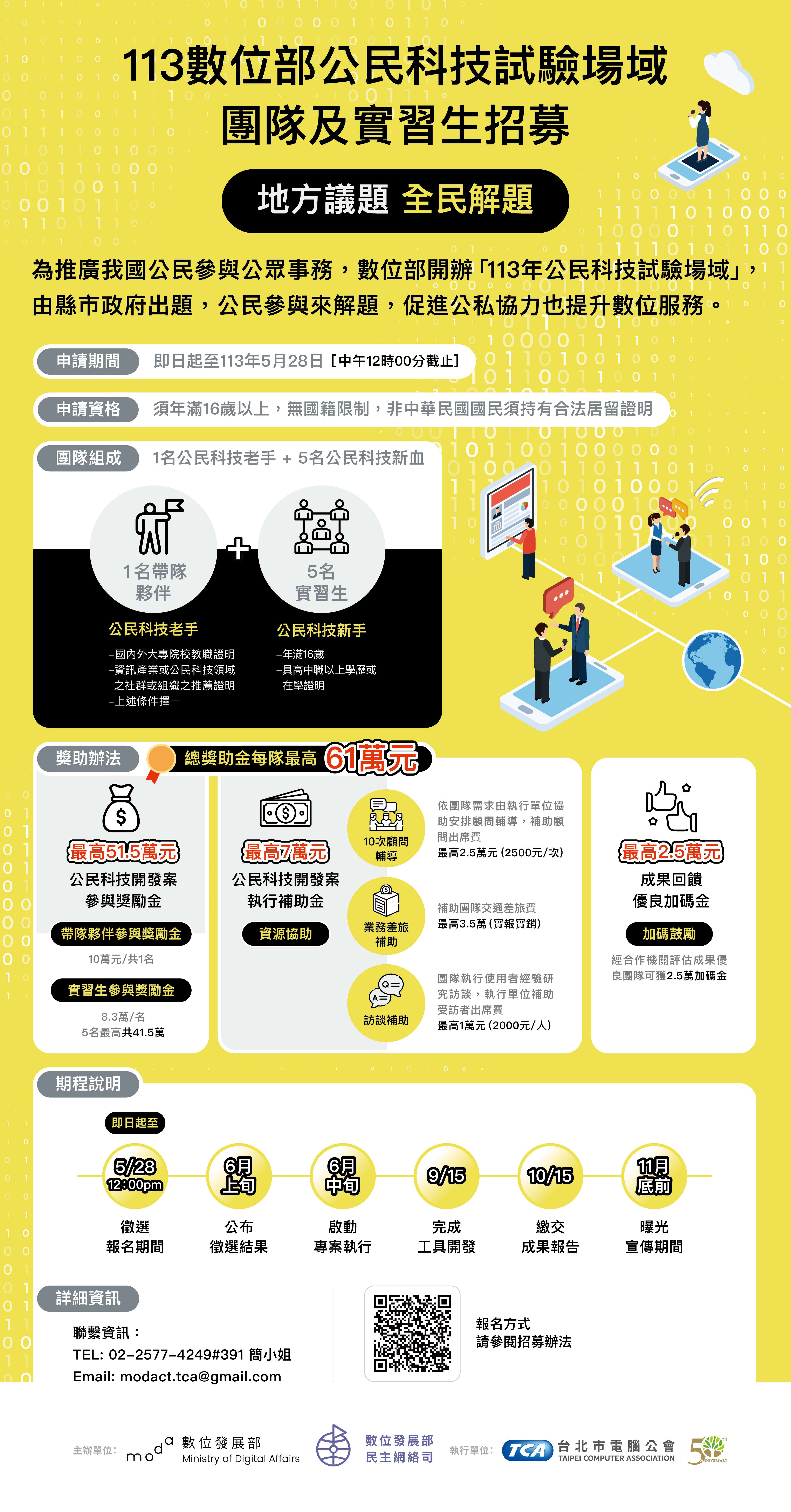 數位發展部招募公民科技試驗場域合作團隊與實習生: