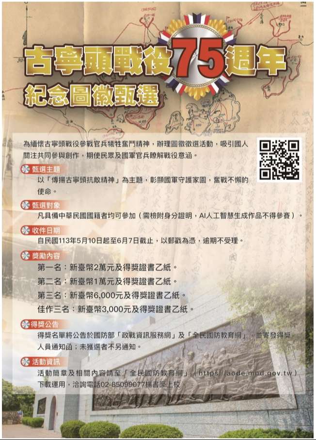 為緬懷古寧頭戰役參戰官兵犧牲奮鬥精神,藉由圖徽甄選活動吸引國人關注共同參與創作,期使民眾及國軍官兵瞭解戰役意涵 ,歡迎踴躍參加圖徽甄選活動,詳如附件。