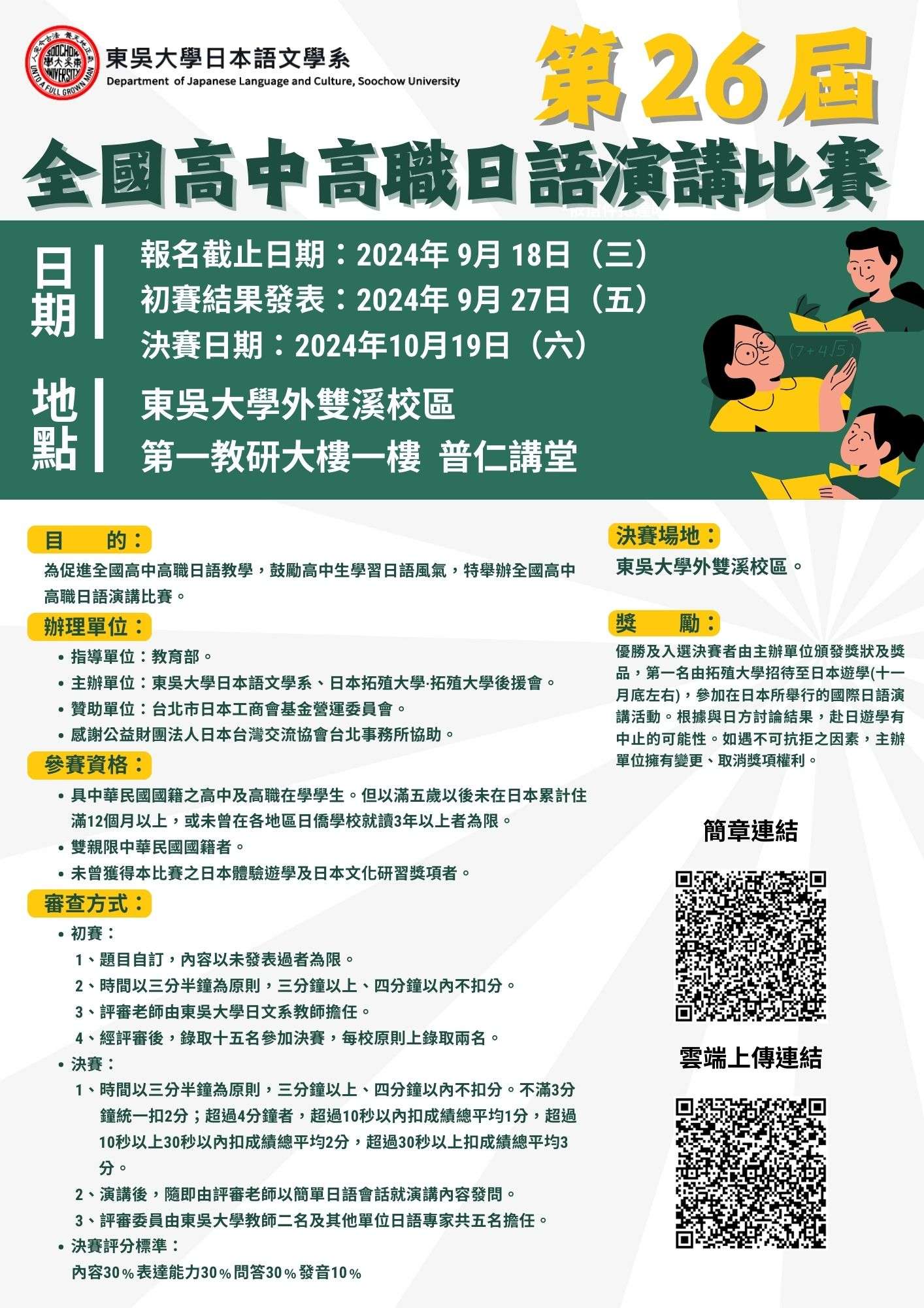 主旨:檢送東吳大學「第26屆全國高中高職日語演講比賽」辦法。