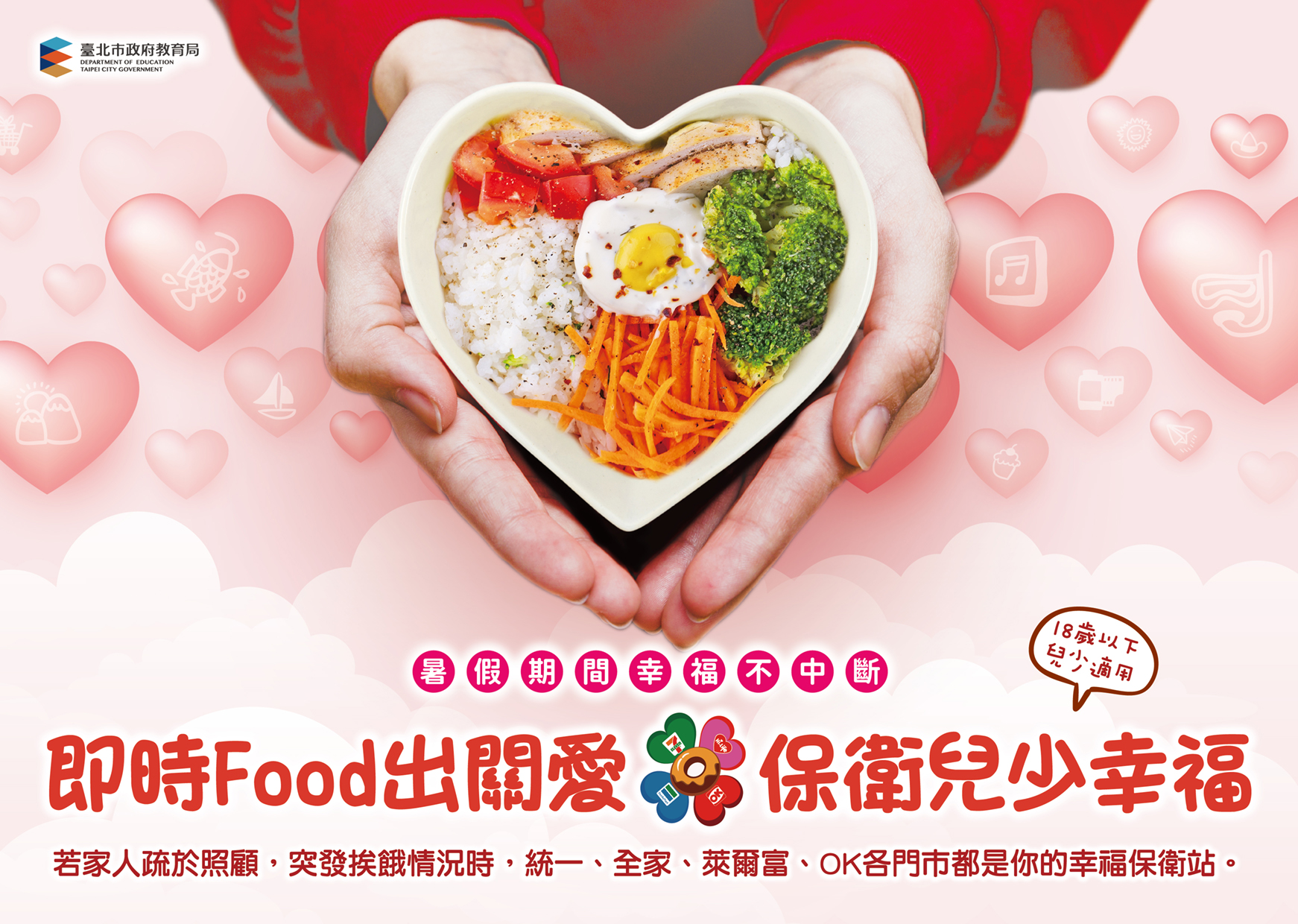 2.因應暑假即將來 臨,為讓在假期中遭遇急難之兒少能善用資源,請各校利 用本學期末之集會時間再次向全校師生宣導幸福保衛站, 也透過家長會或家長群組轉知相關訊息,讓所有親師生知 道「暑假期間陷困之兒少只要身處北臺八縣市範圍內,都 可以就近向四大超商門市求助取餐。」
