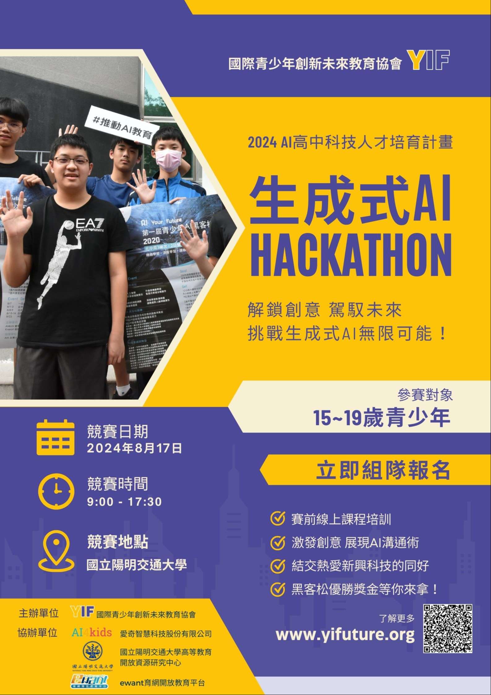 一、競賽目標:為了促進中學生對生成式 AI 原理的深入理解與跨領域應用能力,國際青少年創新未來教育協會將聯合AI4kids、國立陽明交通大學高等教育開放資源研究中心以及 ewant 育網開放教育平台,在暑假期間舉辦生成式 AI黑客松競賽。本次活動旨在提升青少年的科技素養,激發他們在未來學習和生活中創新應用生成式 AI 的潛能。