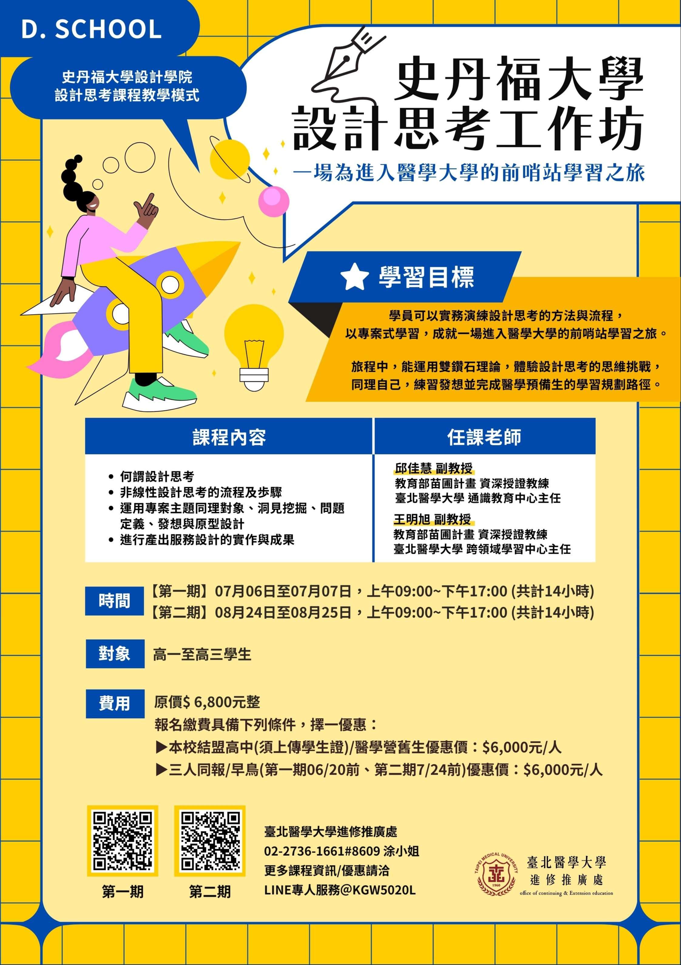 一、本工作坊引入史丹福大學設計學院(D. School)的設計思考 課程教學模式,讓學員可以實務演練設計思考的方法與流 程,以專案式學習,並能運用雙鑽石理論,體驗設計思考 發散與收斂的思維挑戰,同理自己、練習發想並完成醫學 預備生的學習規劃路徑,展開穩紮穩打的實踐步驟,成就 一場進入醫學大學的前哨站學習之旅。