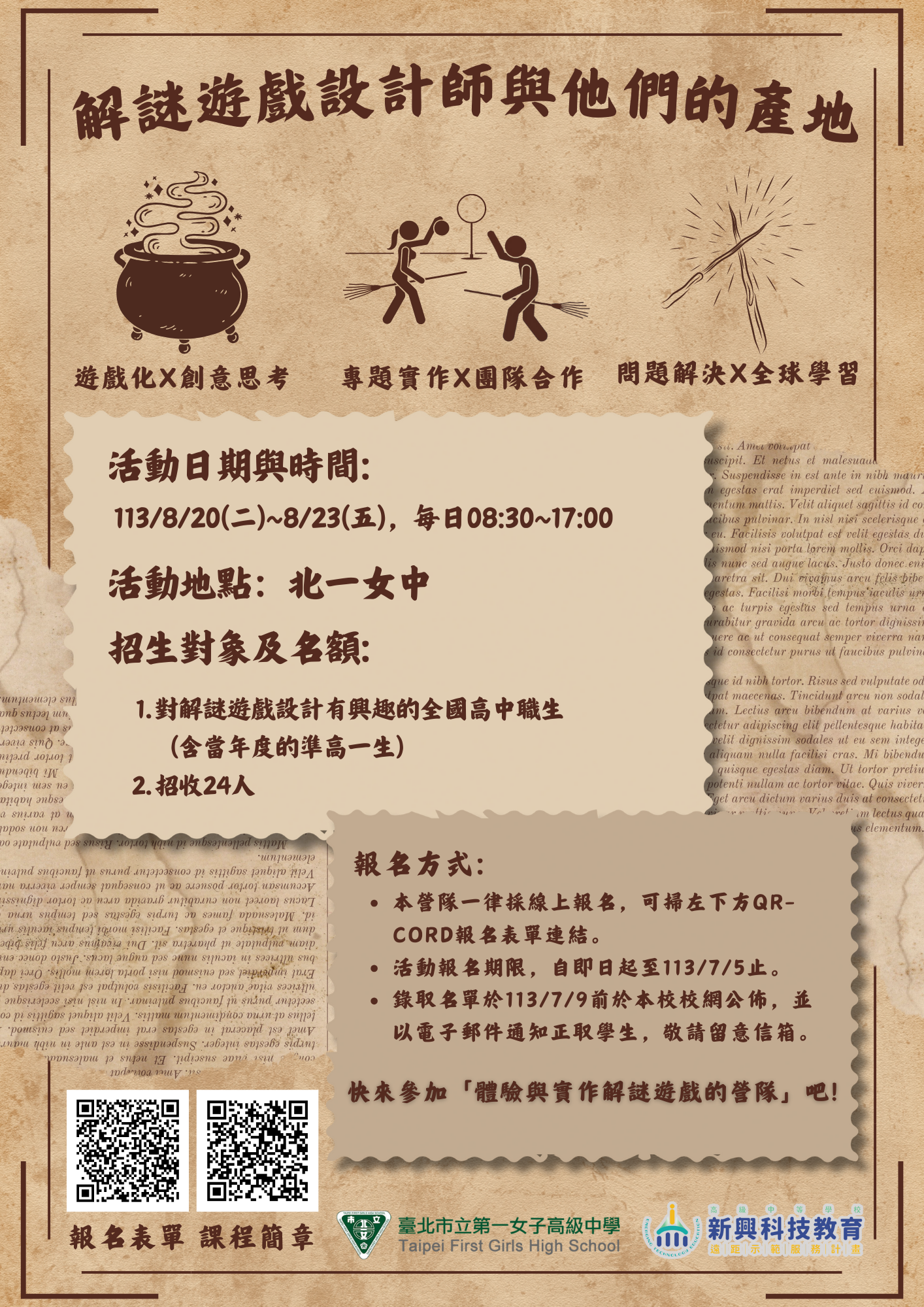 五、招生對象: (一)全國高中職學生對解謎遊戲設計領域有興趣者(二)高中職學生(含當年度的準高一生), 24 人為限。