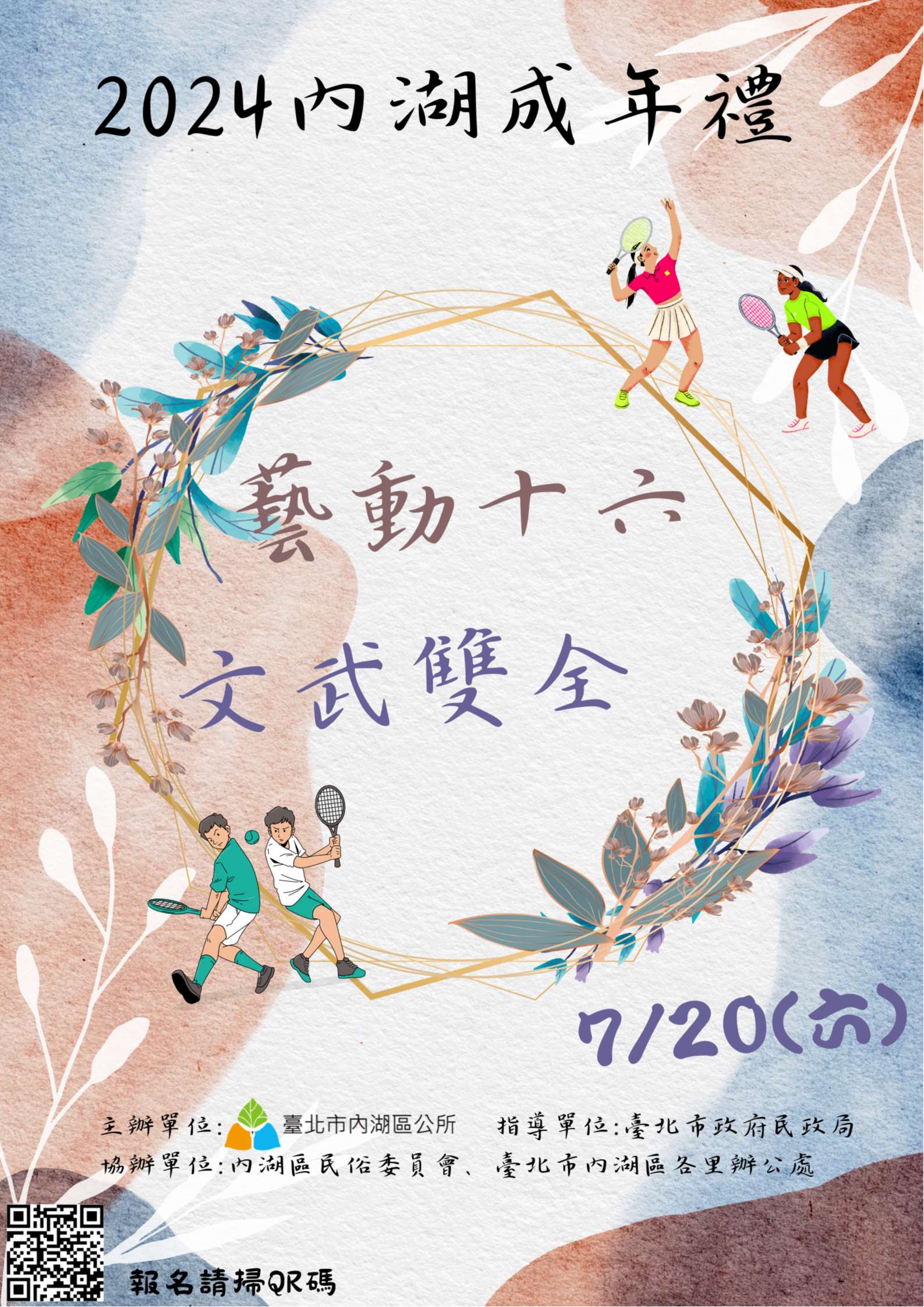 一、「內湖區公所113年7月20日成年禮活動,內容包含新住民表演、手作體驗、成年禮儀式及任天堂Switch互動遊戲,歡迎設籍或就讀於臺北市之青年男女(民國95、96、97年次)踴躍報名參加。」