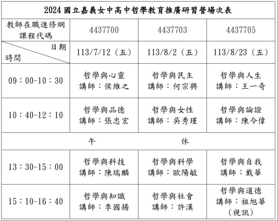 一、旨揭研習資訊如下: (一)目的:為推動高中哲學普及教育,籌劃特色課程教材編 寫,並培育教學種子教師。 (二)時間:113年7月12日、8月2日、8月23日,共三場次。 (三)地點:國立嘉義女子高級中學(嘉義市西區垂楊路243 號)。 (四)講師:國立中正大學哲學系教師團隊。 (五)參加對象:高中在職教師,每場次限額30名。