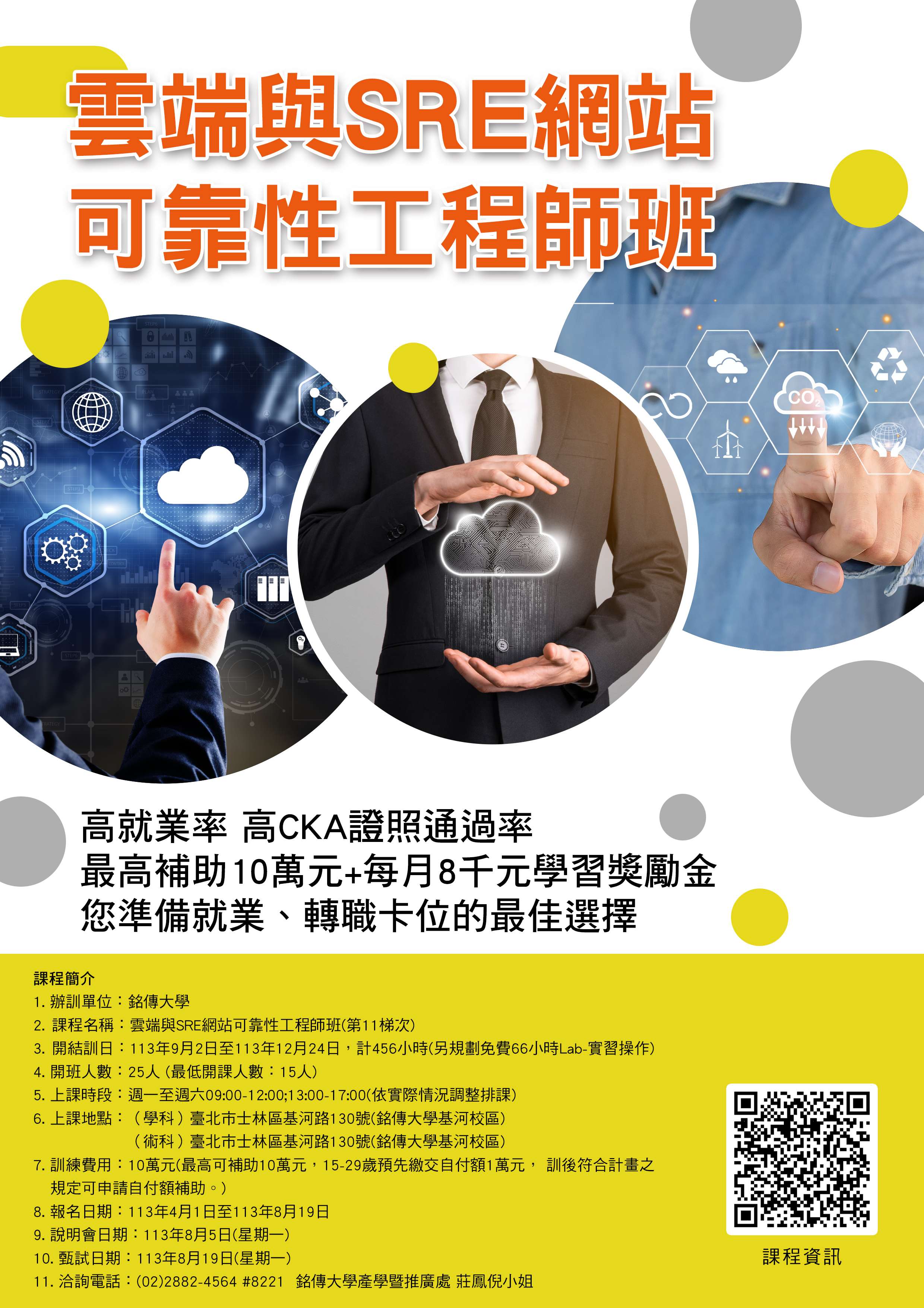 一、為因應SRE網站可靠性工程師廣大人才需求,並配合政府 「亞洲矽谷」計畫,以協助青年就業,本校規劃辦理雲端 與SRE網站可靠性工程師班。