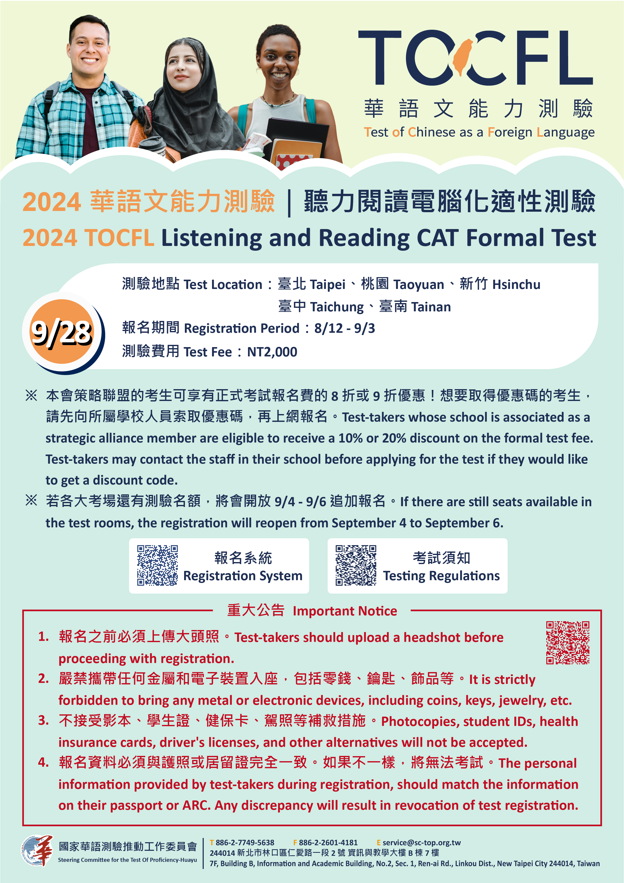 主旨:轉知國家華語測驗推動工作委員會辦理「華語文能力測驗」113年9月正式考試事宜,詳如說明。
