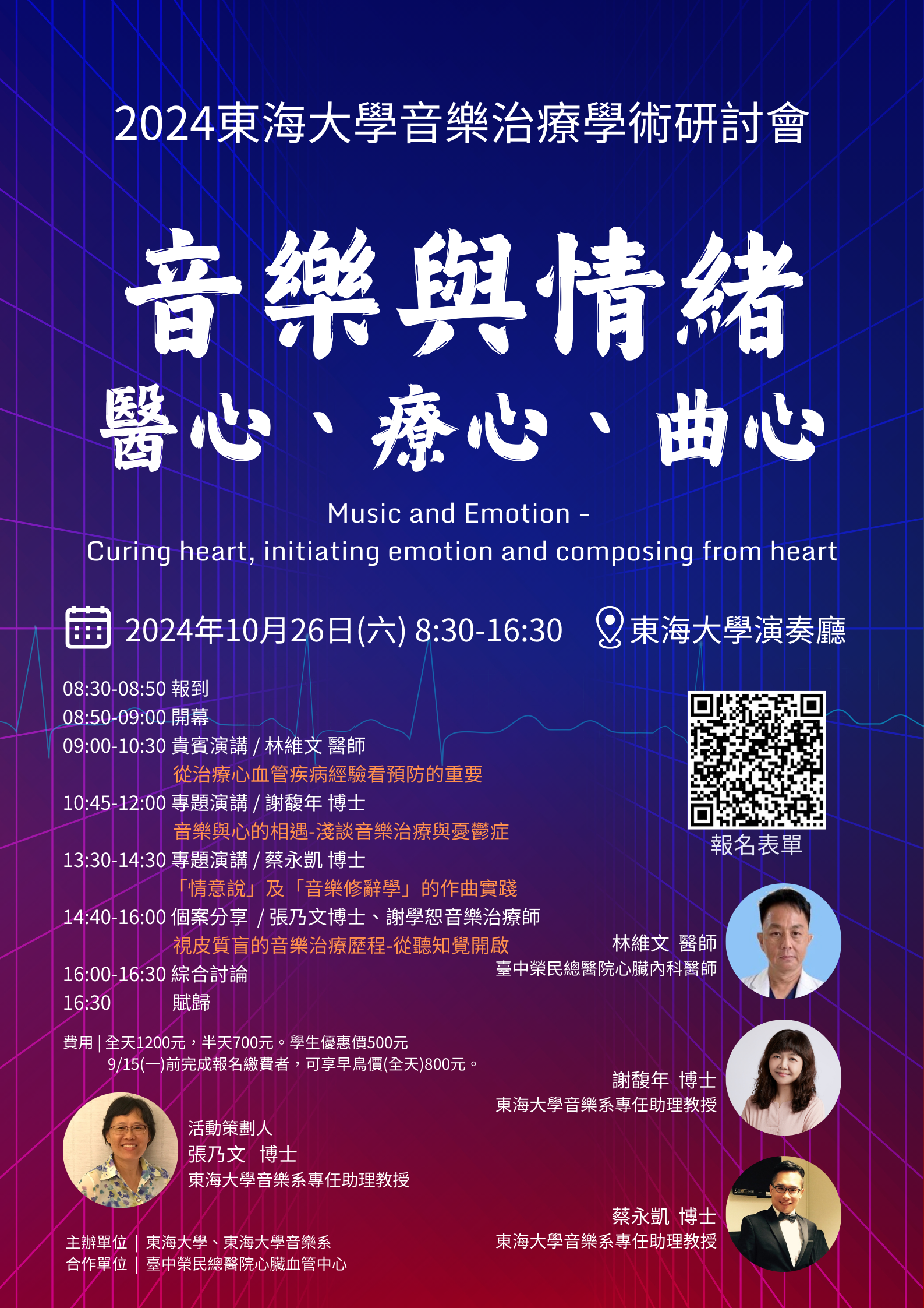 二、詳細活動資訊如下: (一)研討會時間:113年10月26日(星期六)8:30-16:30。(二)研討會地點:本校演奏廳(第二教學區音樂系館)。 (三)報名連結:請點此