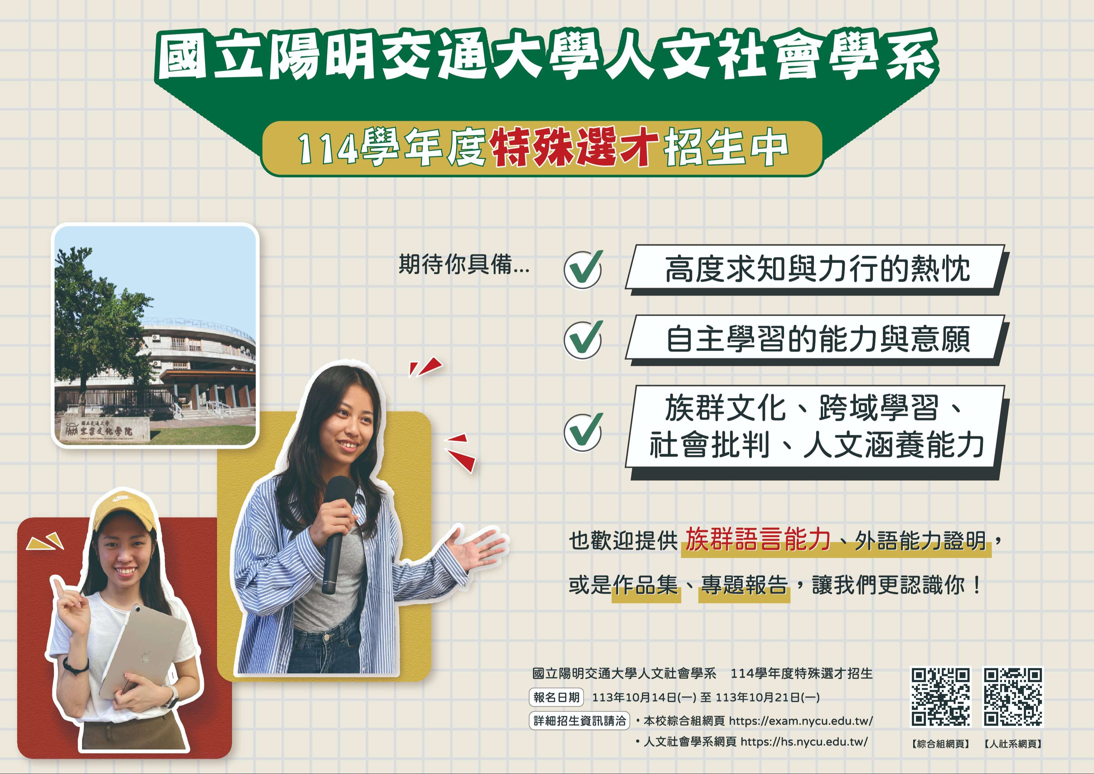 一、本校人文社會學系擬招收具備高度求知與實踐的熱忱、自 主學習的能力與意願,並具備「族群文化」、「跨域學 習」、「社會批判」、「人文涵養」能力之學生。