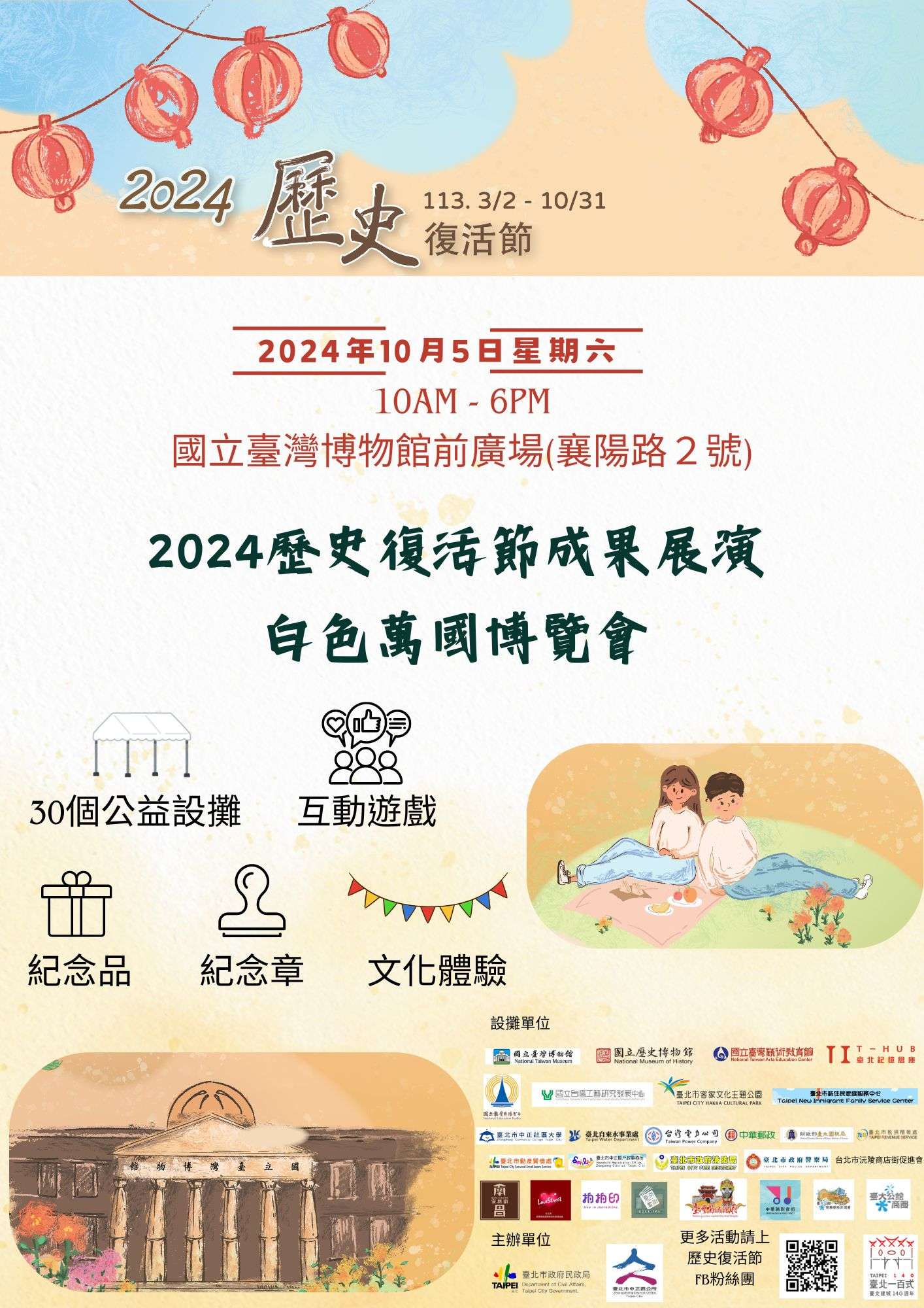 113年10月5日(星期六)上午10時至下午6時假 二二八和平公園-國立臺灣博物館本館(襄陽路2號前廣 場舉辦。