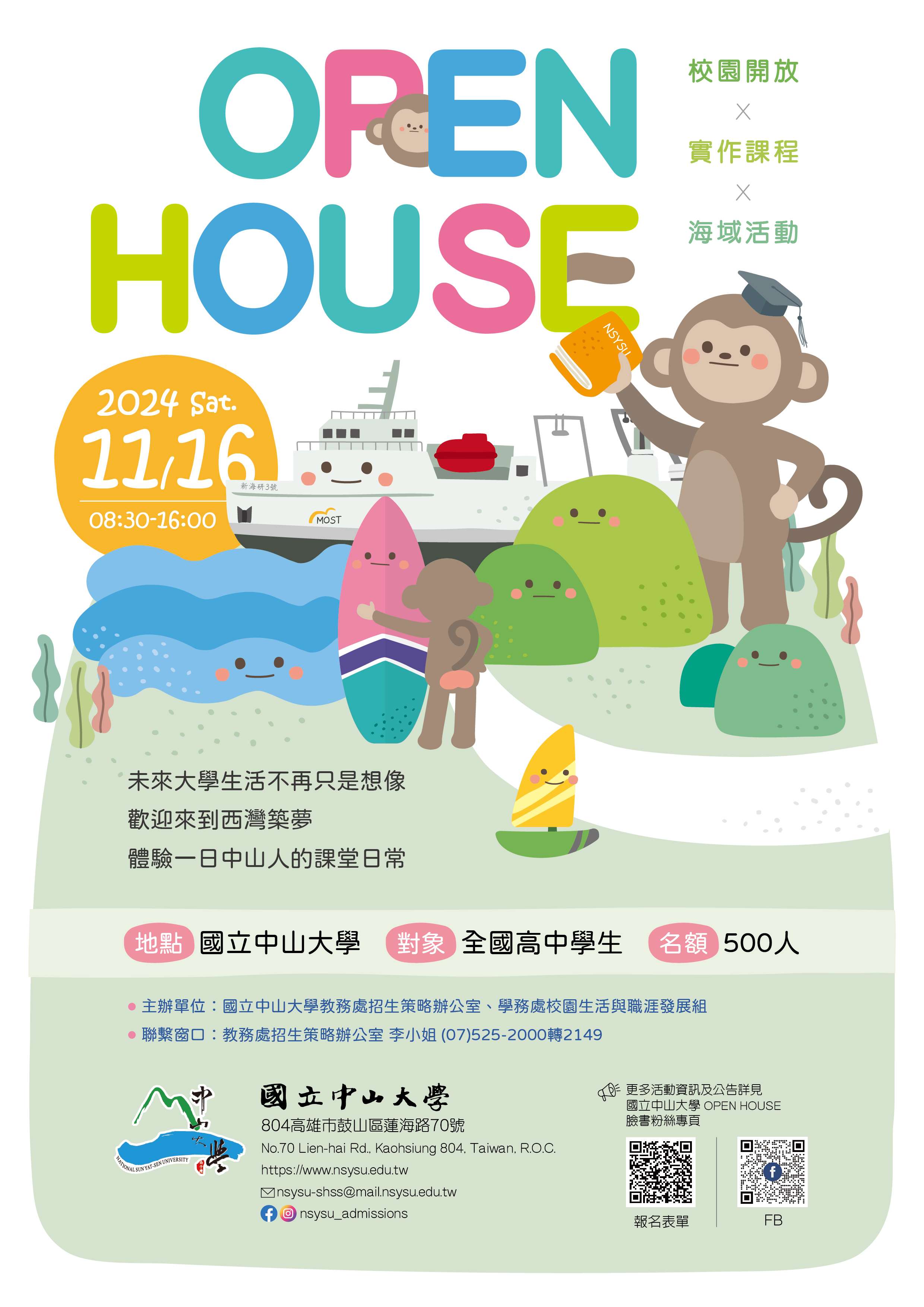 一、本校以專業課程、實驗室參訪及海域活動體驗辦理校園開 放日,使高中學生跳出原有學習之框架模式,體驗本校跨 領域課程與特色體育活動,讓未來大學生活不再只是想 像,爰邀請全國高中學生來到西灣築夢,體驗一日中山人 的課堂日常。