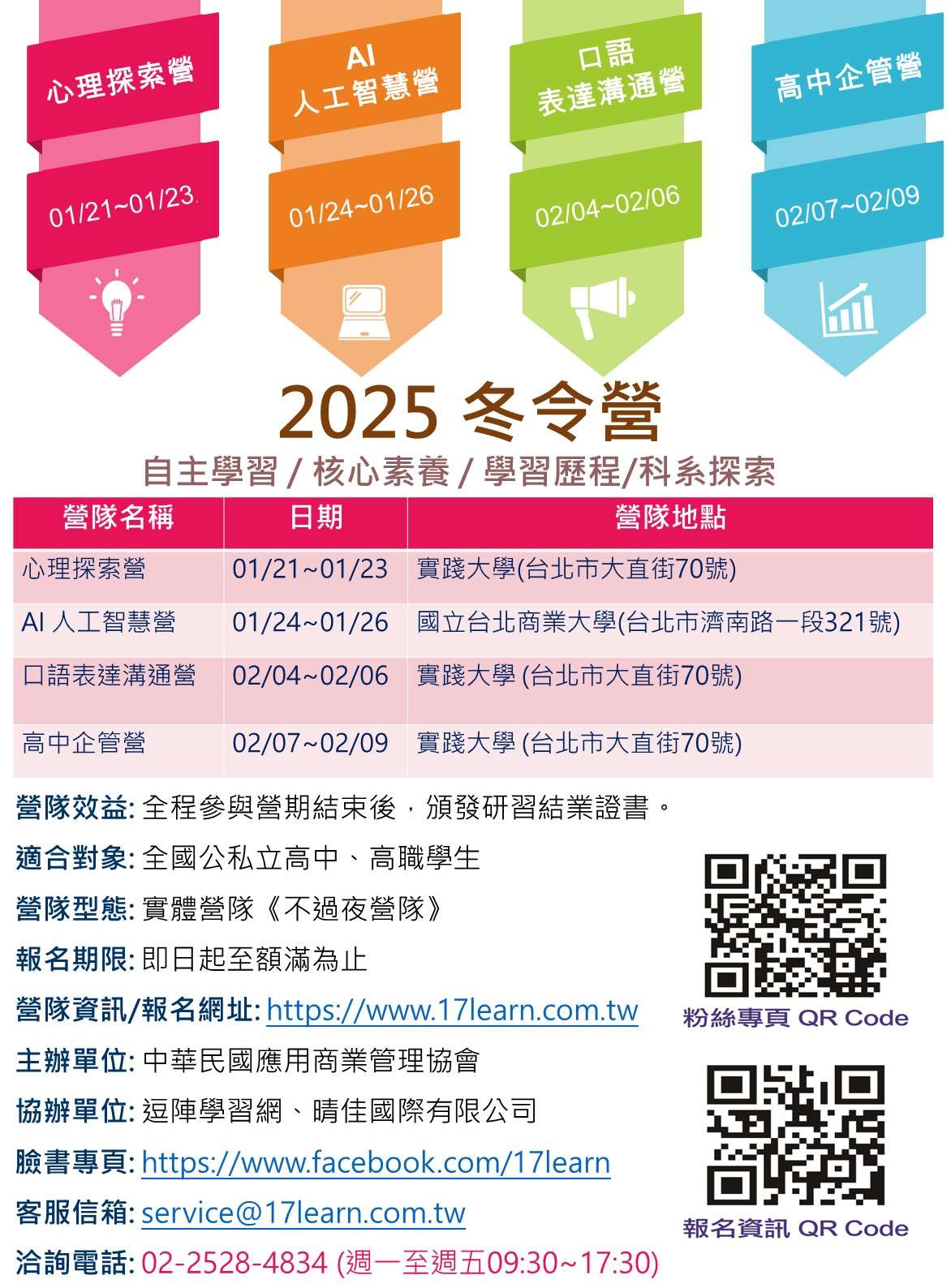 二、營隊名稱:「心理探索營」、「AI人工智慧營」、「高中企 管營」、「口語表達溝通營」。