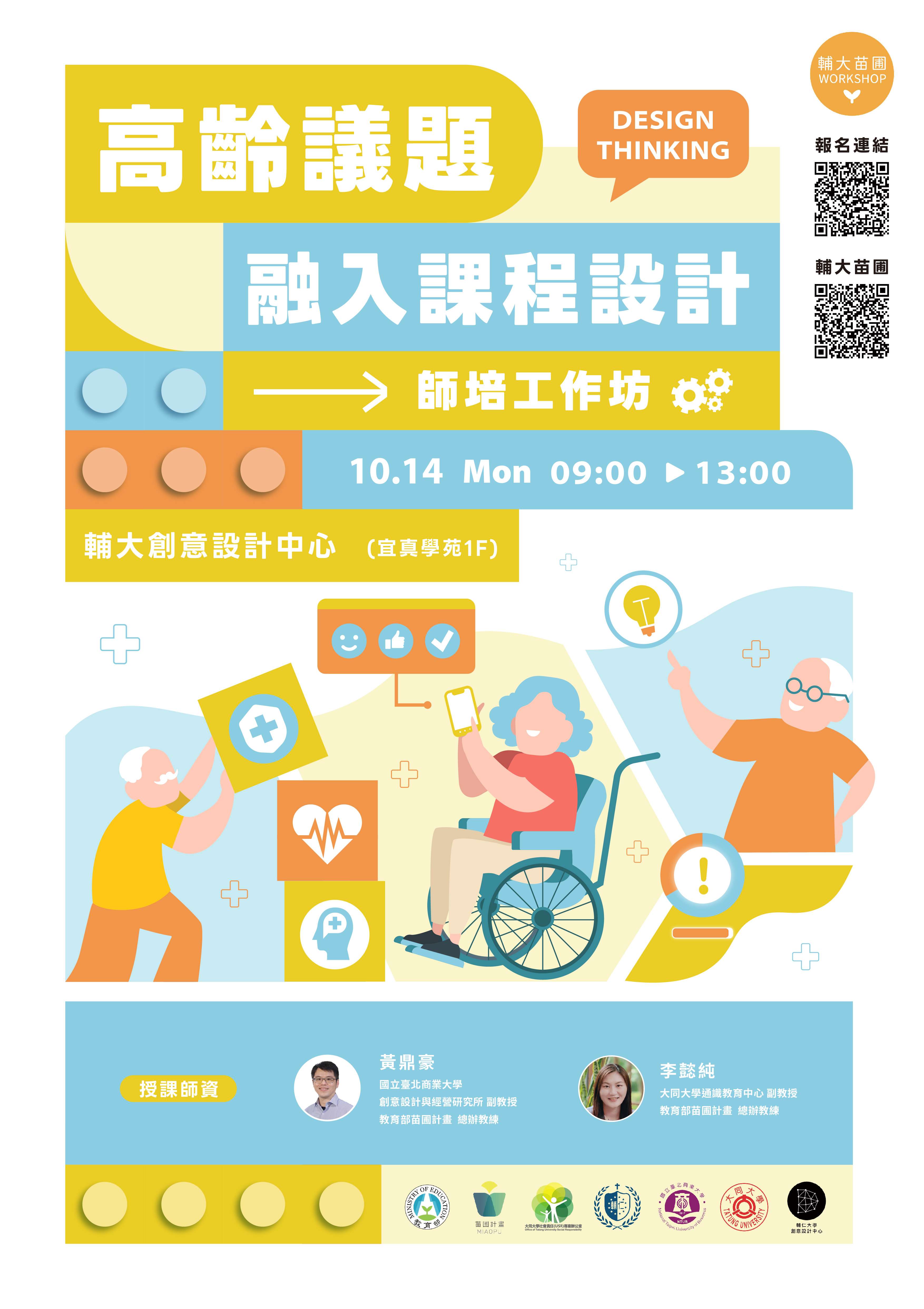 一、活動目的:本活動由教育部「跨領域教師發展暨人才培育 計畫」補助辦理,本工作坊將以高齡議題為方向,引導教 師共創並深入探索議題內涵,於探索過程中反思自我課程 的對接與鏈結。期望協助教師於本工作坊後,即有一個可 行且兼具真實議題之課程模組,並透過模組引導學生實 作、思考「高齡社會」議題及高齡者的需求與痛點分析, 並提出相對應的社會問題解決方案。 二、活動訊息如下: (一)活動日期:113年10月14日(一)。 (二)活動時間:上午9時00分至13時00分,並於活動開始前30 分鐘開始報到。 (三)活動場地:輔仁大學創意設計中心(宜真學苑1 樓)。(四)參加對象:全國大專院校及國高中教師。 (五)合辦單位:大同大學社會責任(USR)專案辦公室