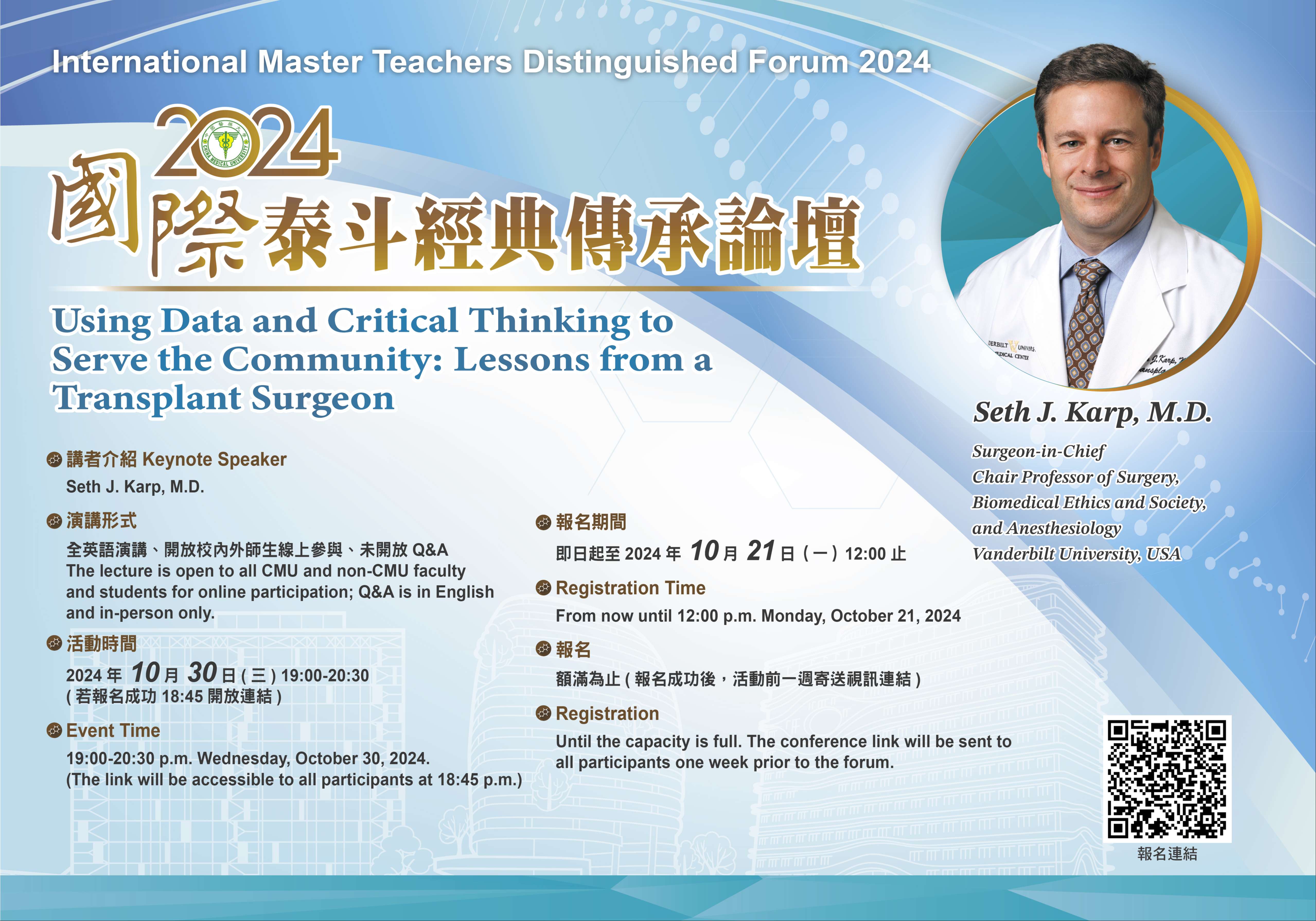 一、活動主旨:2024國際泰斗經典傳承論壇(International Master Teachers Distinguished Forum 2024)邀請到美國 范德堡大學(Vanderbilt University)醫學院外科、生物醫 學倫理學與社會和麻醉學教授兼范德堡大學醫學院暨醫學 中心的主任外科醫生Seth J. Karp, M.D.進行演講,以其 醫療服務經驗來分享所見所聞,相信能讓與會師生收穫豐 碩。