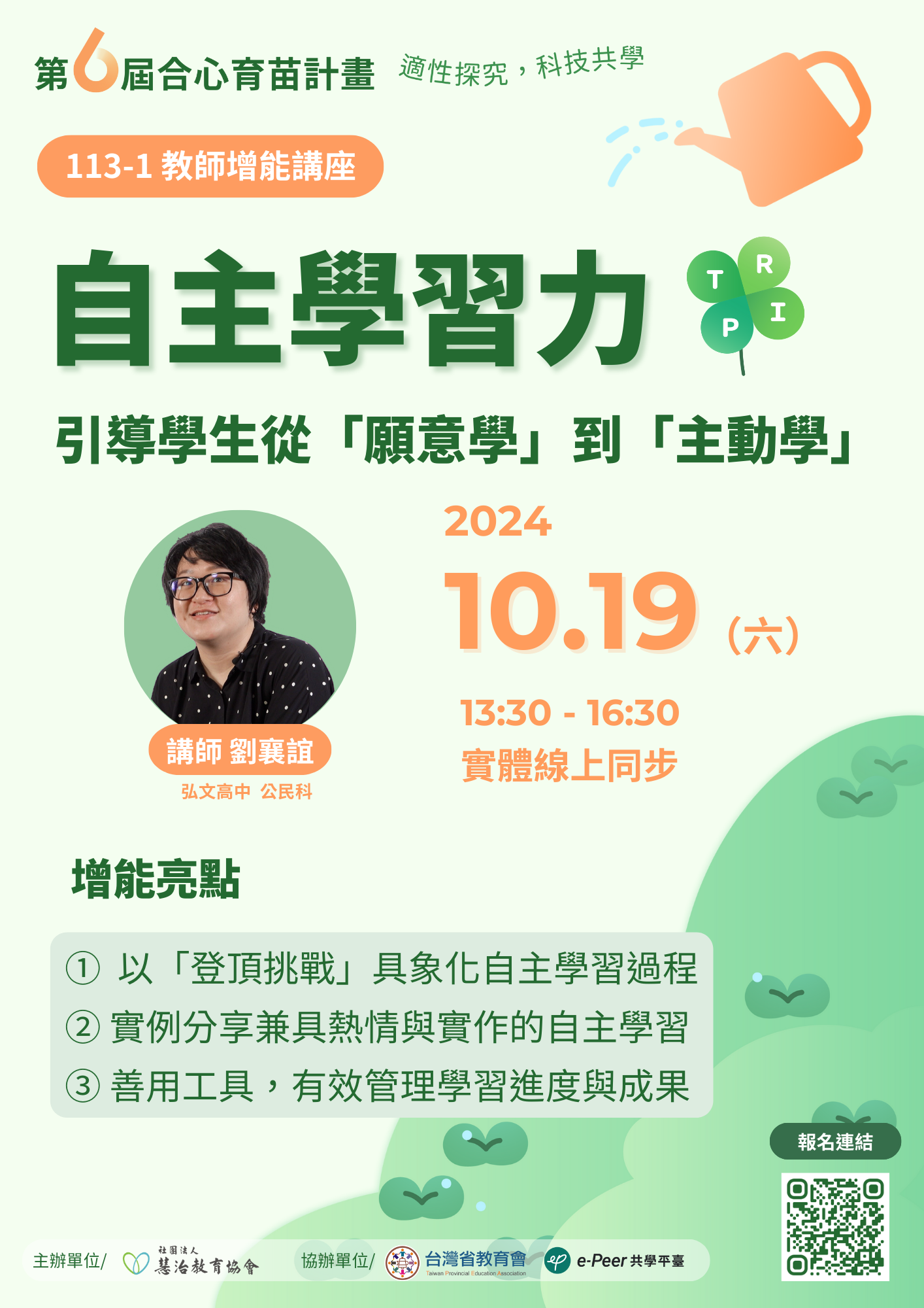 二、活動資訊:(一)主題:自主學習力:引導學生從「願意學」到「主動學」。(二)時間:113年10月19日(星期六)下午13時30分至16時30分。(三)活動形式:虛實整合,實體與線上同步進行。(四)參與對象:全台高中職教師。(五)研習時數:每場提供3小時的研習時數,如需研習時數可於回饋單留下身分證字號,以利後續作業。(六)報名方式:採線上報名,即日起至10/18中午12:00截止。請點我