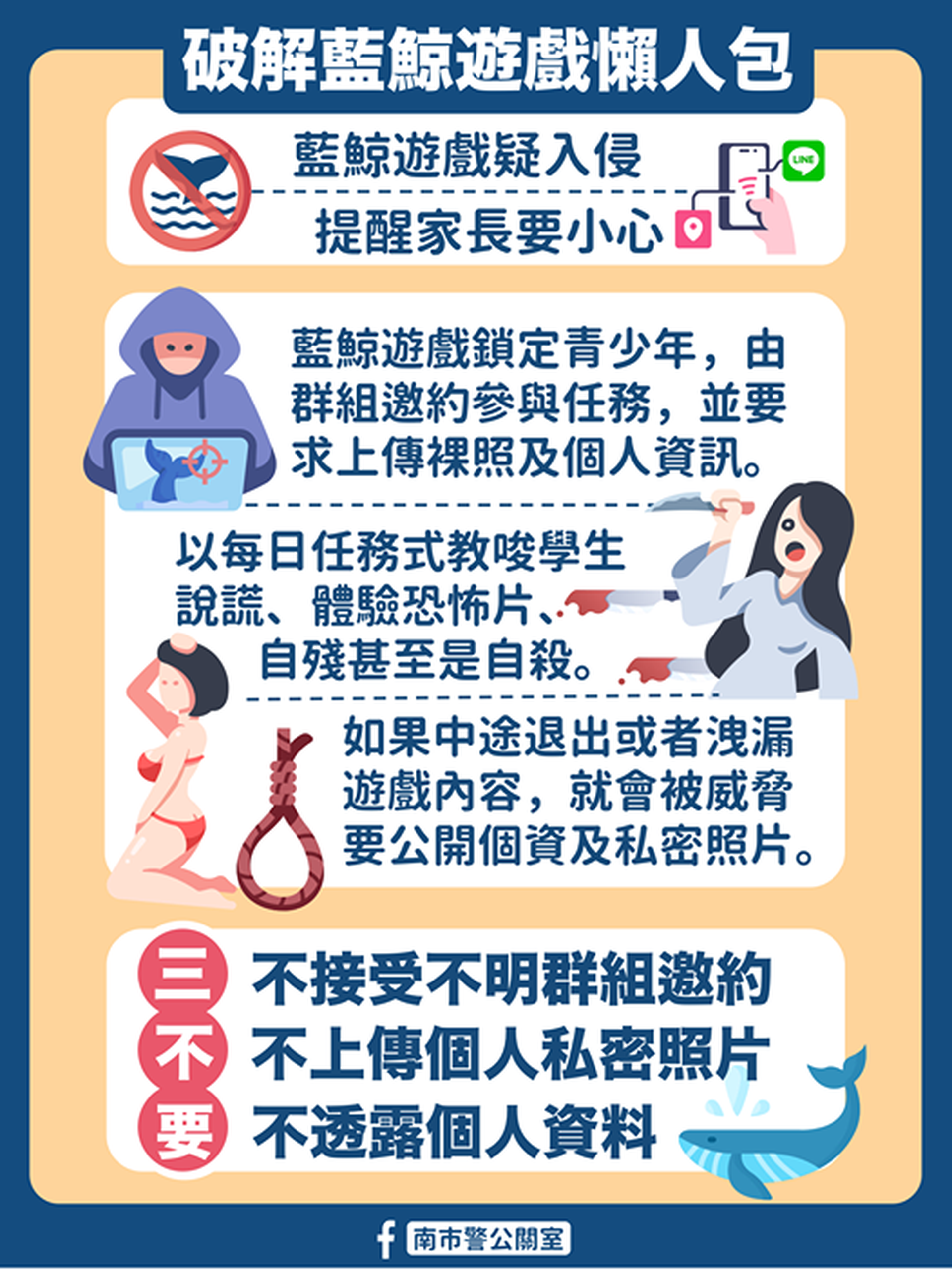 為避免學生於網路上遭有心人士誘導參加「藍鯨遊戲」而加入不明群組引起自我傷害等情形,請持續利用各項