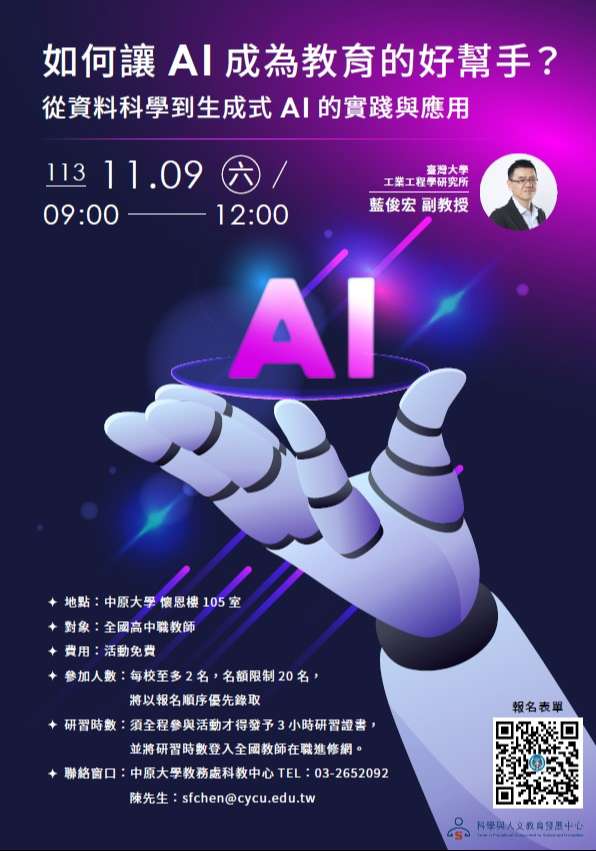 中原大學舉辦「如何讓AI成為教育的好幫手?從資料科學到生成式AI的實踐與應用」活動:
