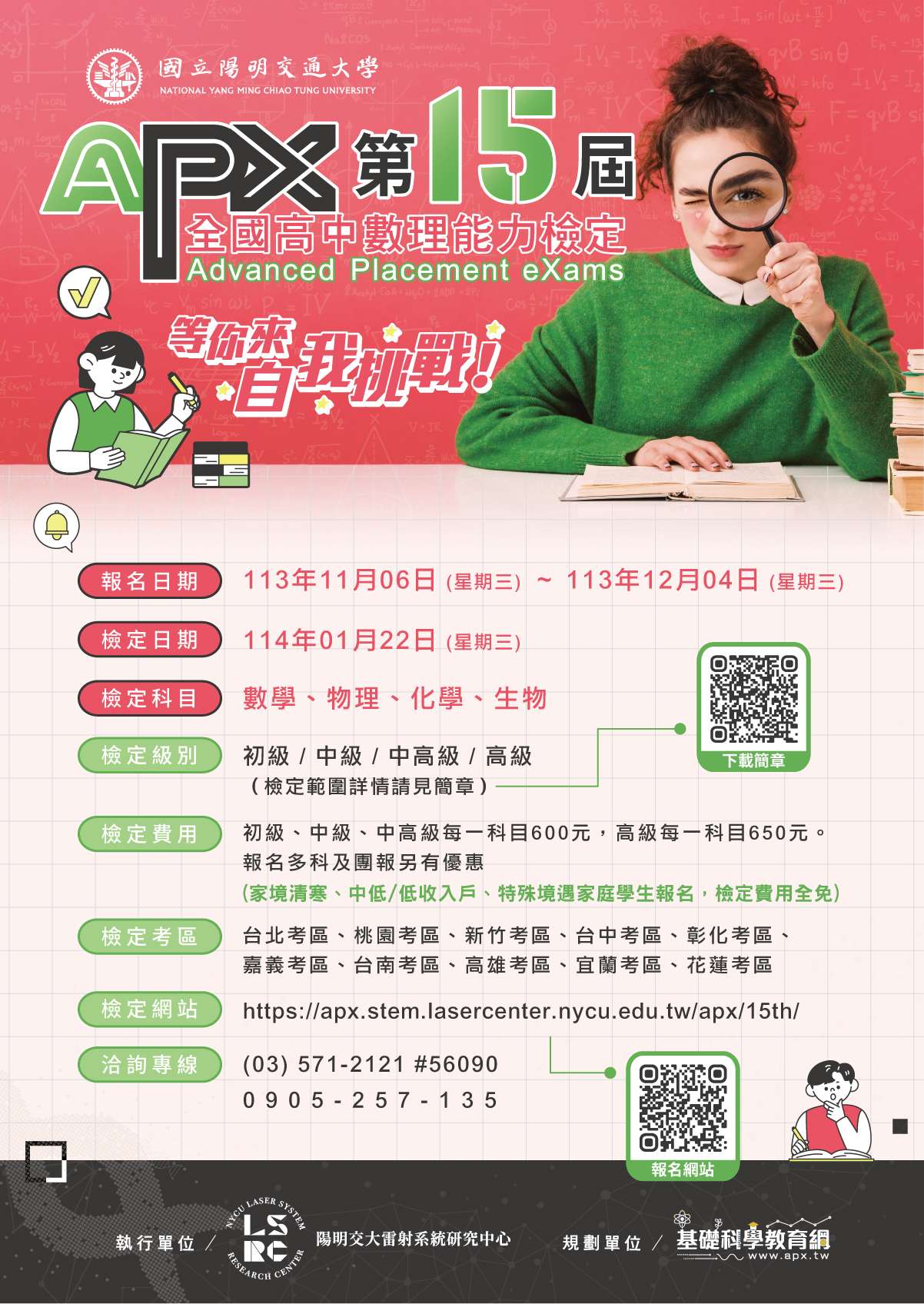 四、檢定科目:生物、化學、數學、物理。