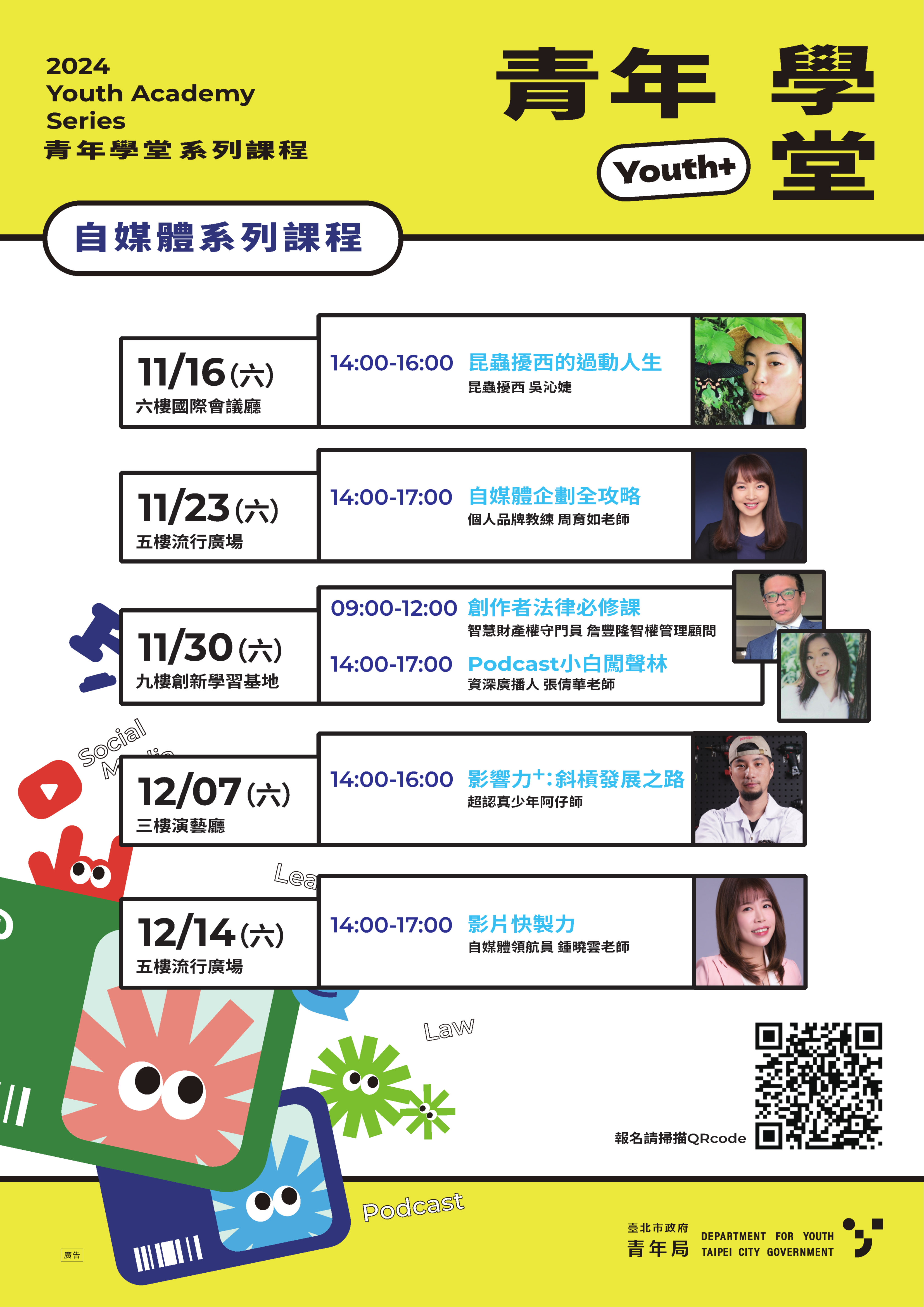 三、檢附「青年學堂-自媒體系列課程」海報電子檔1份,活動內容可詳見報名網頁。若仍有相關問題,亦可洽詢本局郭小姐,電話:02-2351-4078分機1112。