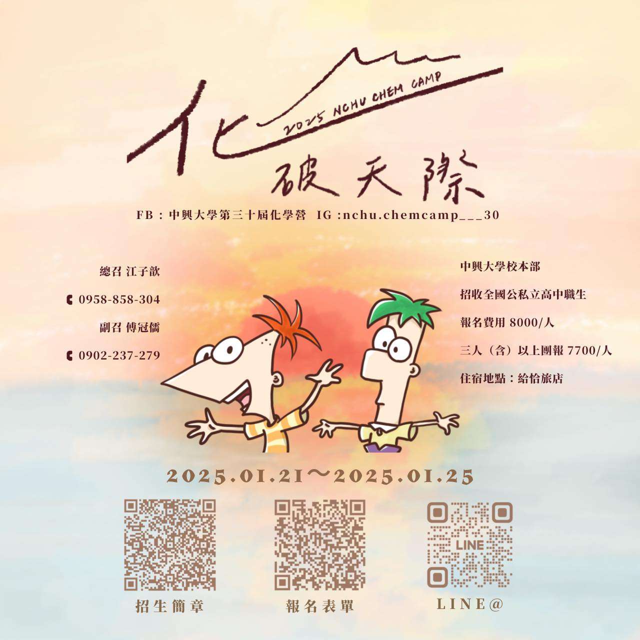 九、報名方式及活動說明:請至Facebook粉絲專頁查詢。Facebook粉絲專頁:國立中興大學第三十屆化學營。 Instagram 官方帳號搜尋:nchu.chemcamp___30