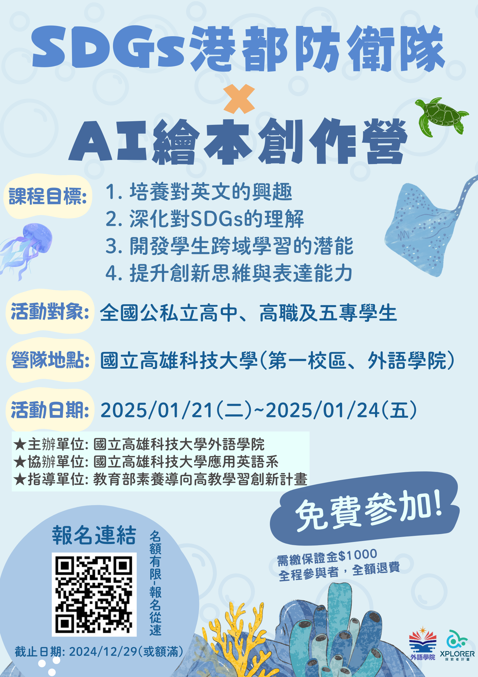 一、本校外語學院執行「教育部素養導向高教學習創新計 畫」,預計於114年1月21日至114年1月24日舉辦「SDGs港 都防衛隊 x AI繪本創作營」。本活動鼓勵全國公私立高 中、高職及五專學生參與並深入探討海洋環境議題,並透 過ChatGPT和AI繪圖生成文字及圖片,並應用於Canva 設計 工具中,產出數位繪本,展現對海洋保育的認識與反思。 本營隊採線上報名,額滿為止。