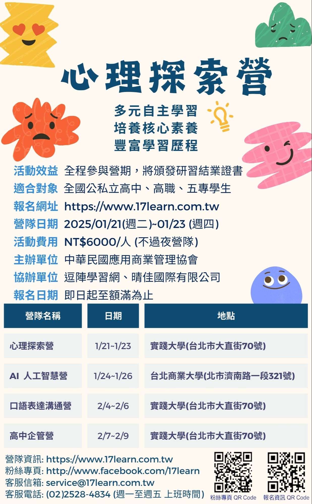 九、其他事項: 如與寒輔撞期,可提供報名證明,以便請假。 另有【AI 人工智慧營】、【口語表達溝通營】、【高中企 管營】等營隊,歡迎報名參加。