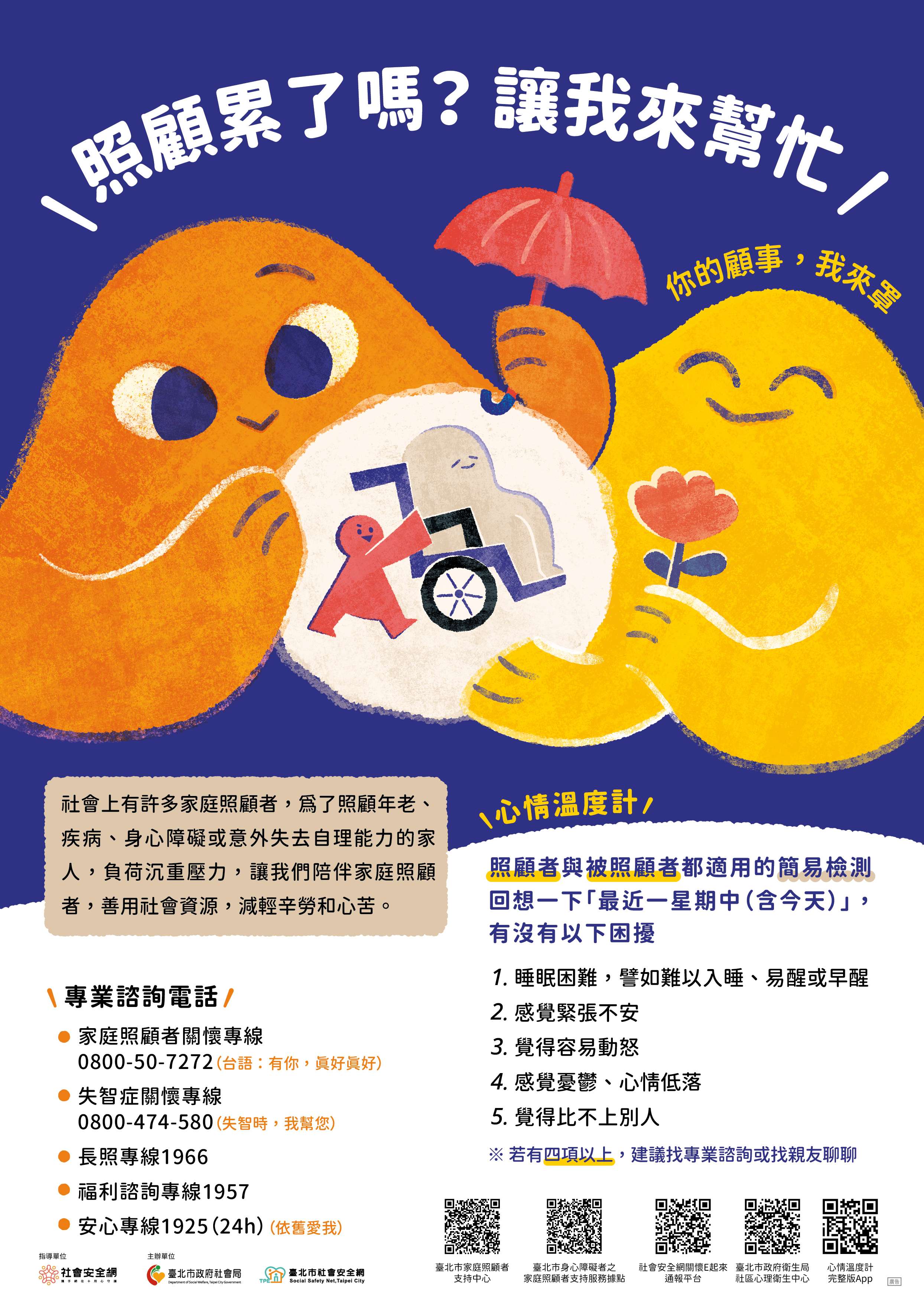 二、為關注「家庭照顧者」心理健康及需求,推廣社區友善互助及長期照顧資源,強化本市超高齡社會支持韌性,爰製作旨揭宣導海報及摺頁文宣。