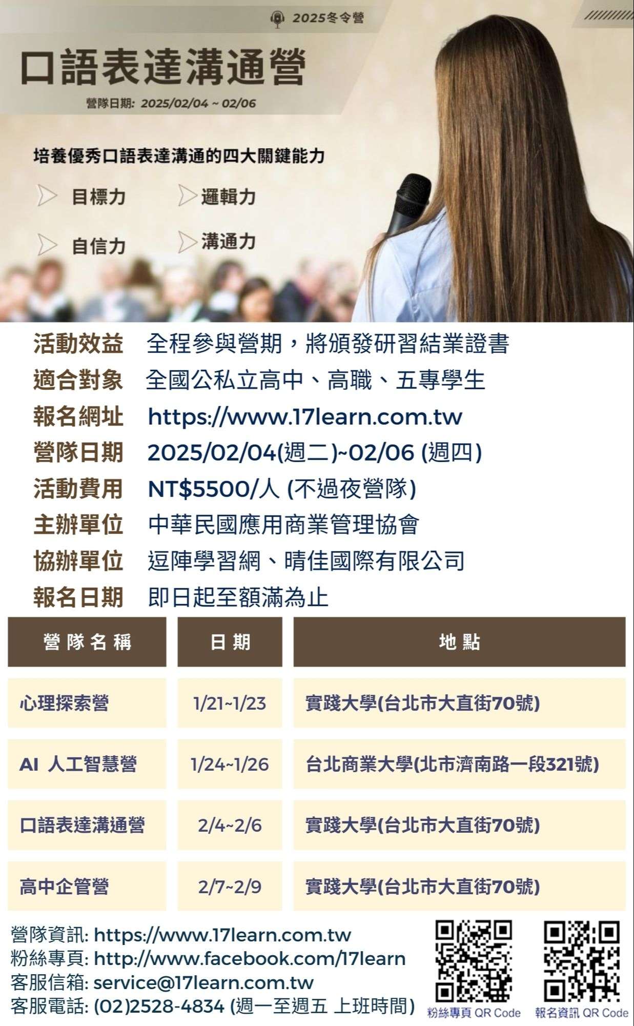 無論是升學口試或求職面談,口語表達已經是現代人不可 或缺的能力。「口語表達溝通營」透過講解、示範、訓練 和不斷的演練,克服公開發言的恐懼,人人都可以成為口 語表達的高手!