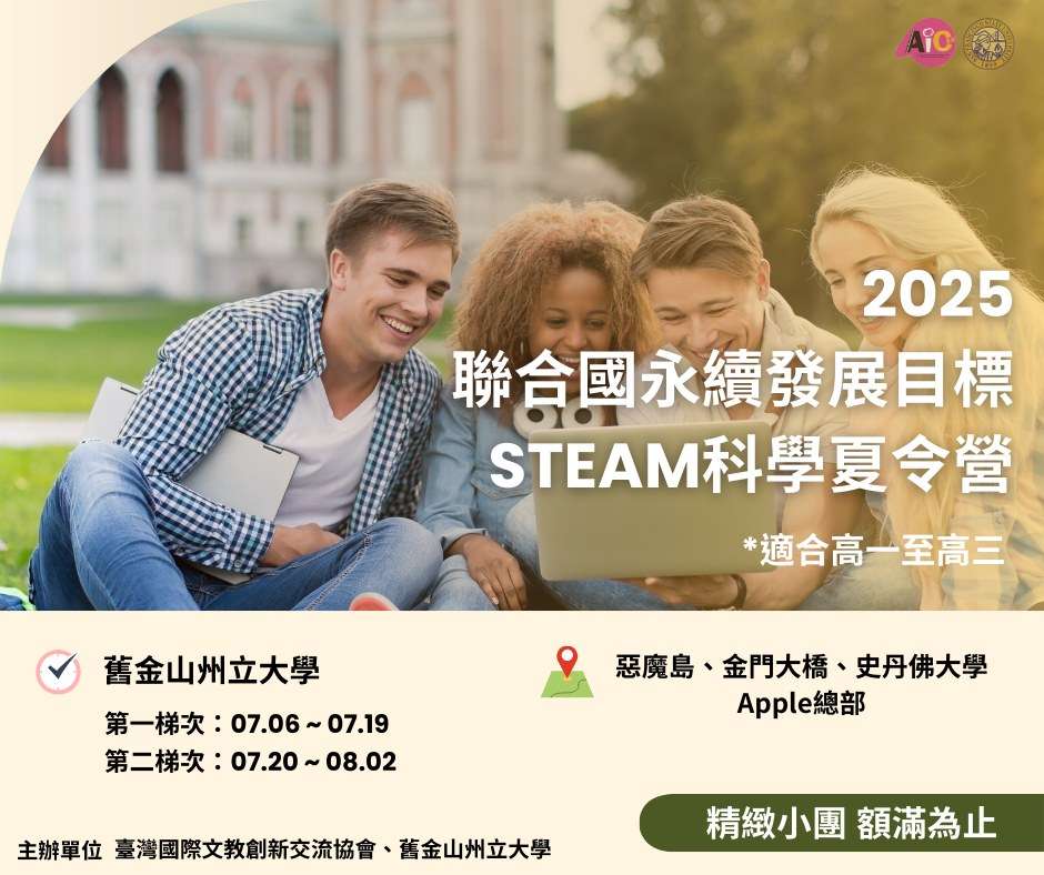 三、本夏令營由本會組團前往美國舊金山,進行國際交流,參與以聯合國永續發展目標及STEAM科學為主題的專題導向學 習課程(Project-based Learning, PBL)。行程將安排參 訪我國駐舊金山辦事處、史丹佛大學及加州大學柏克萊分 校,並造訪矽谷與舊金山著名景點,同時與美國舊金山州 立大學學生進行交流。本夏令營講師團隊陣容堅強,包括 舊金山州立大學、加州大學柏克萊分校之教授與講師,完 成夏令營活動的學生將獲頒舊金山州立大學結訓證書。
