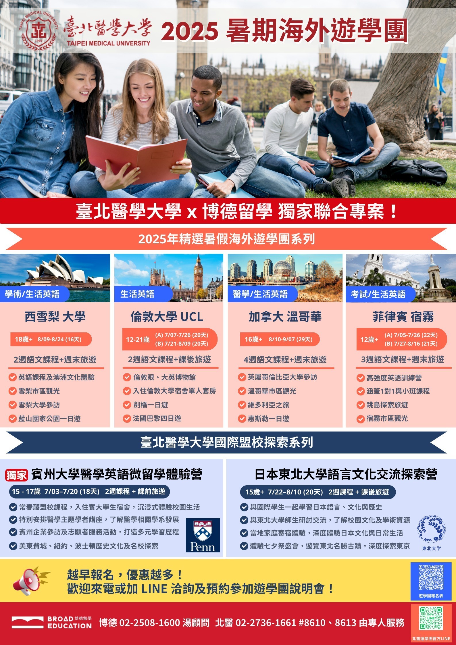 (一)北醫國際盟校 - 賓州大學醫學英語微留學體驗營(2025 /07/03-2025/07/20,共18天),適合15-17歲學生。