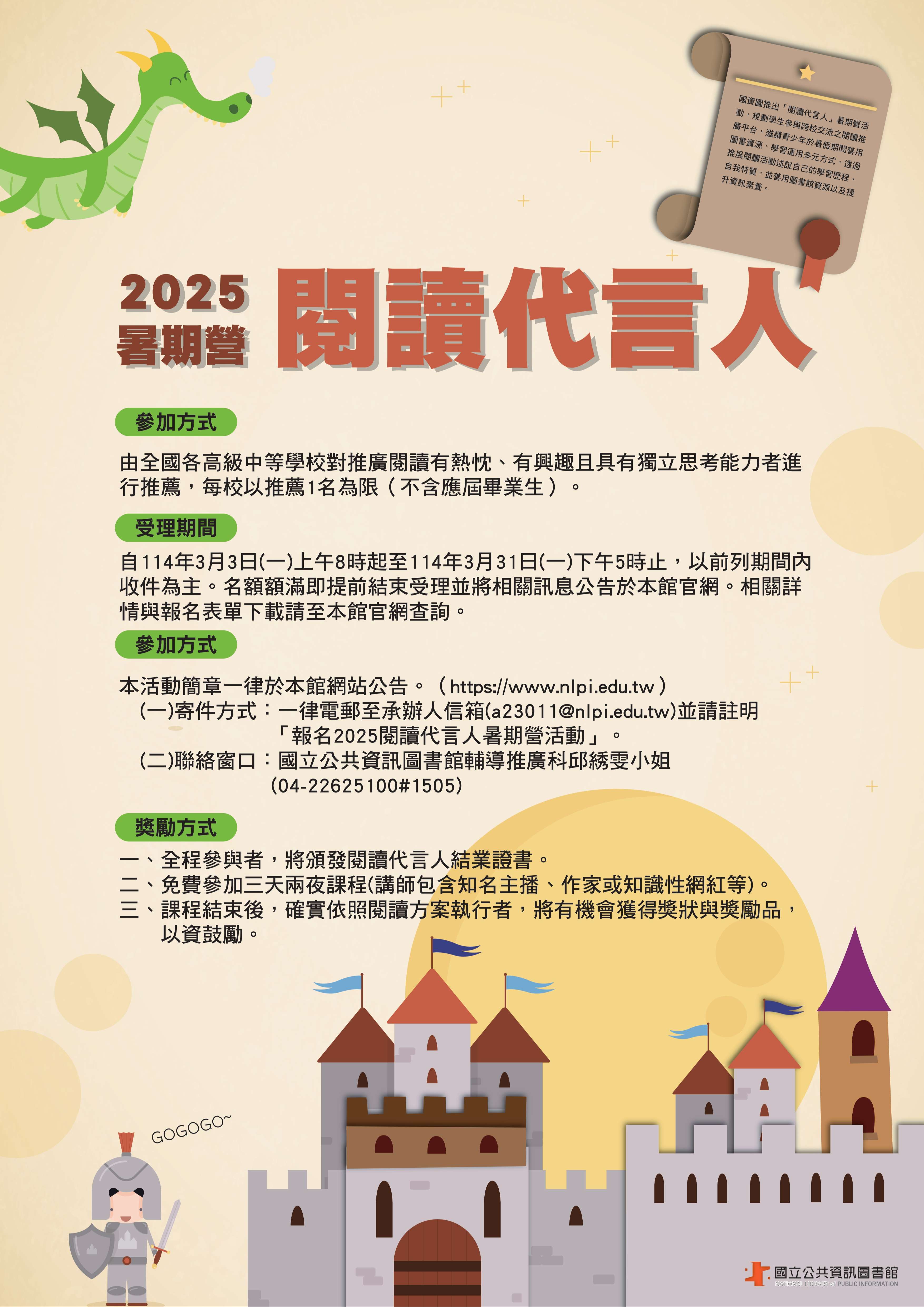 國立公共資訊圖書館辨理2025「閱讀代言人」暑期營活動: