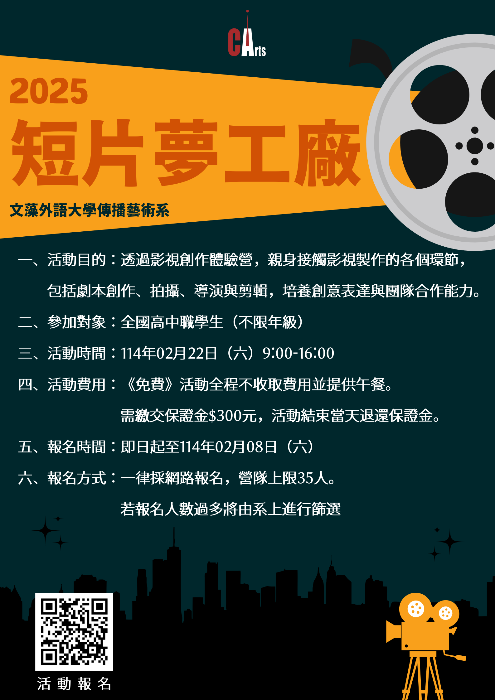 一、本校傳播藝術系將於114年2月22日上午9時至下午4時,辦 理【2025短片夢工廠】影視創作體驗營,對象為全國高中 職學生,名額35名,額滿為止,請轉知學生踴躍報名。