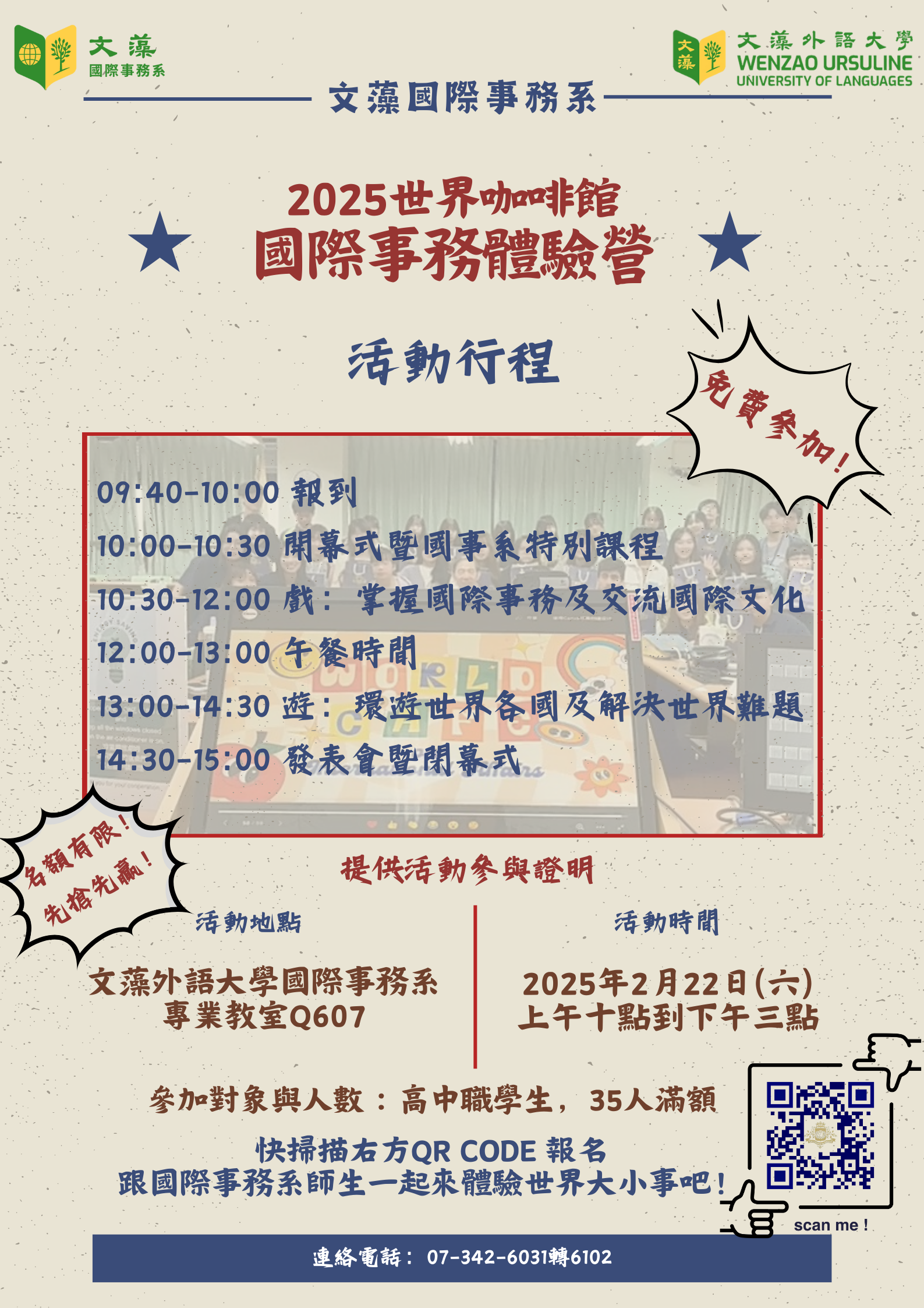 (四)活動費用:免費,與本校國際事務系師生來體驗世界大 小事。