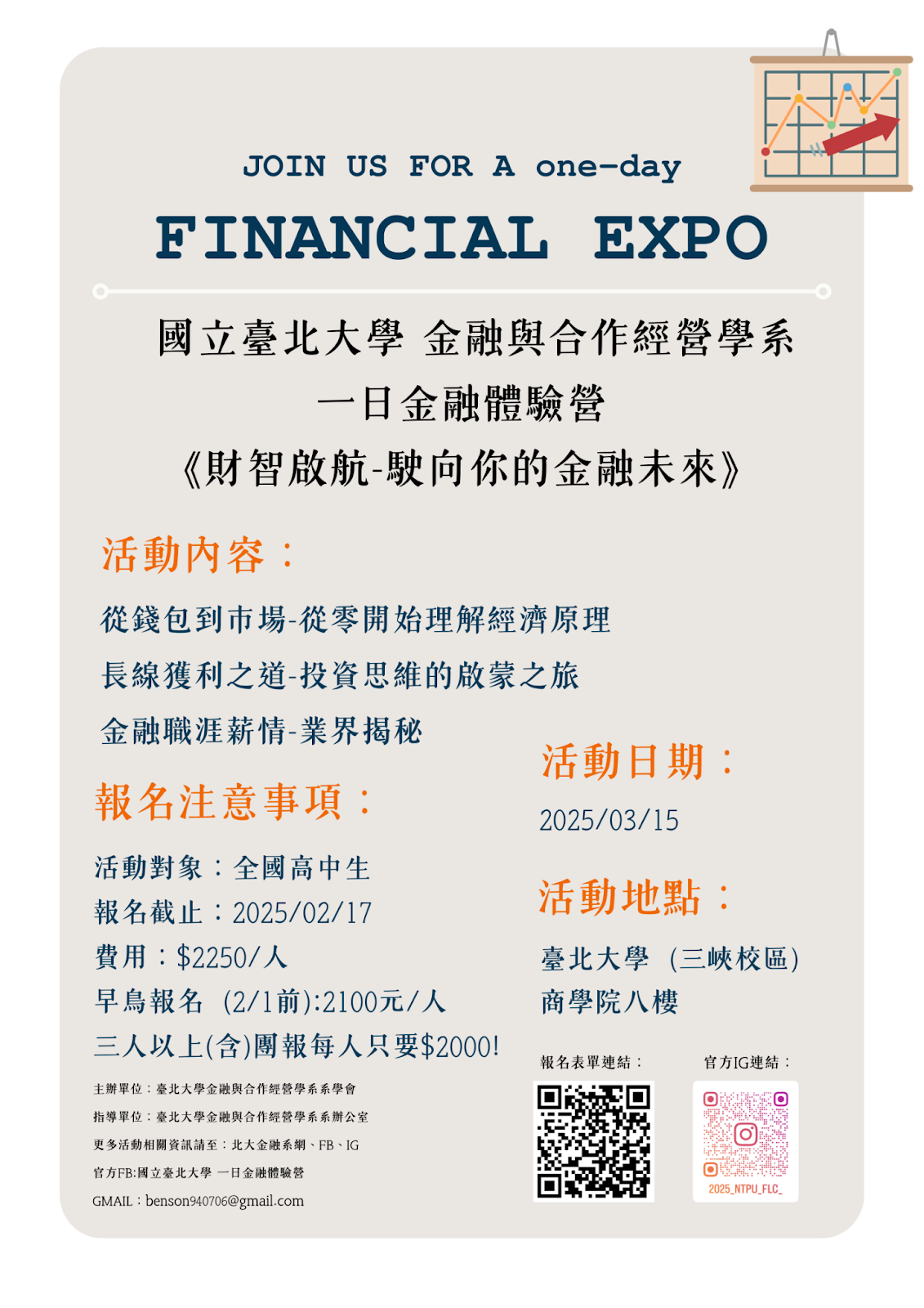一、期盼學員透過參加本活動能深入認識金融系,以確認未來 學習方向與職涯規劃是否符合期待。