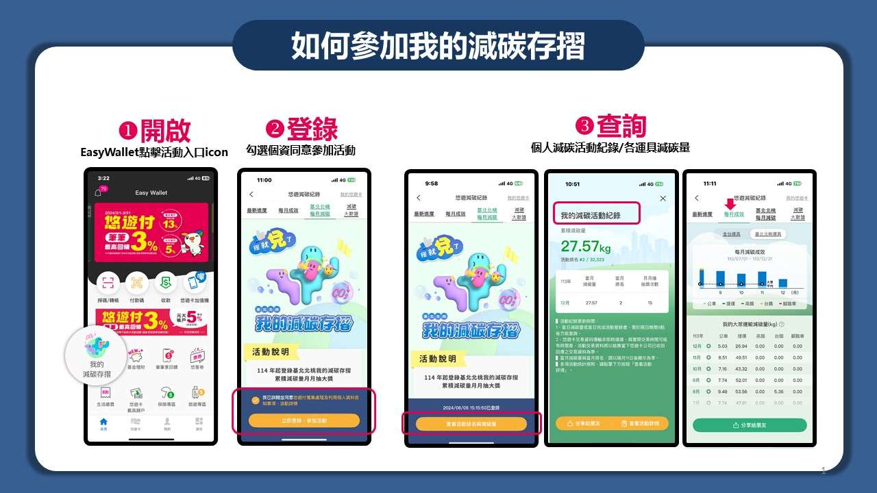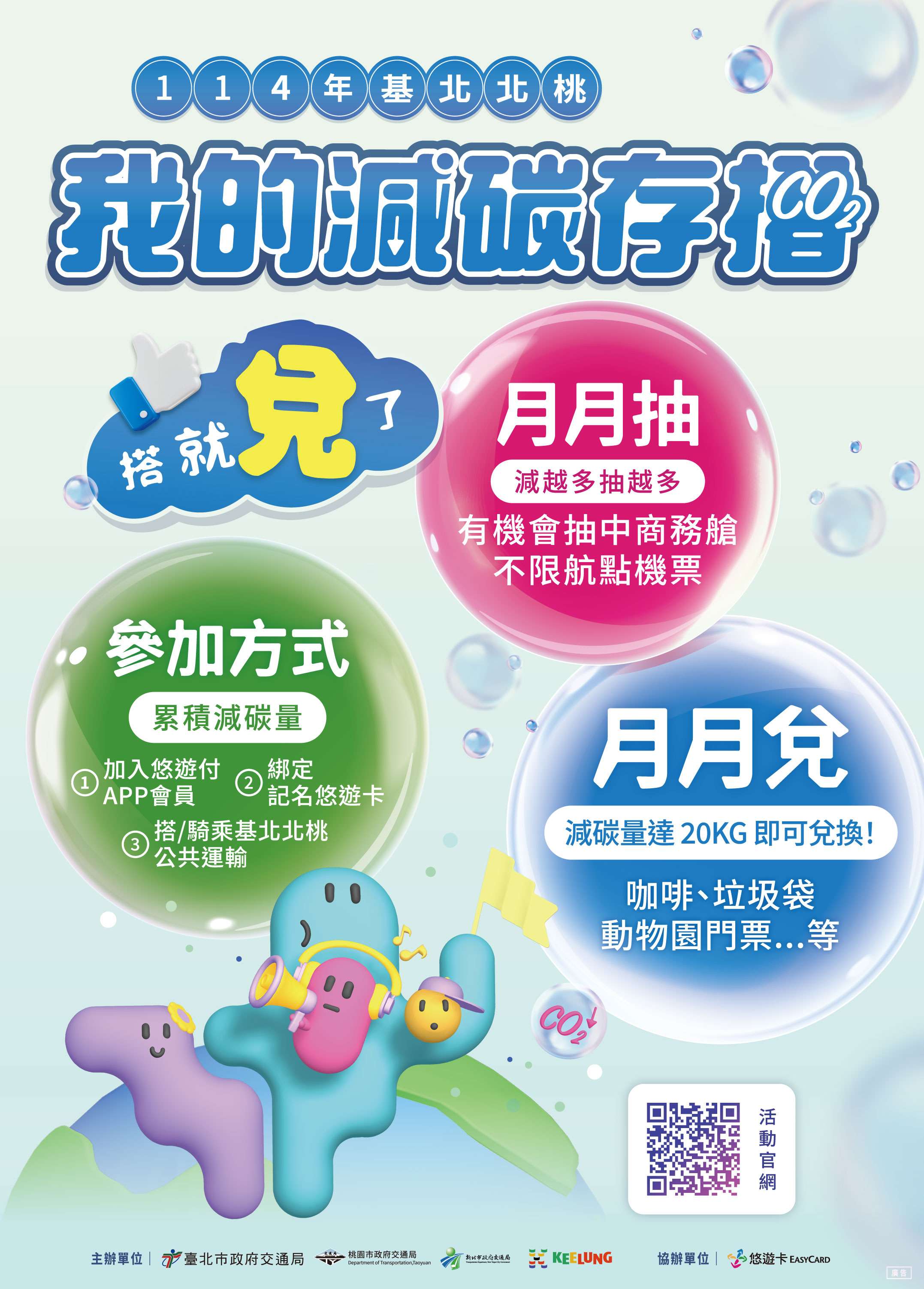 一、為攜手市民多加使用公共運輸,以朝淨零碳排目標前進,由政府、企業一起帶動全民綠運輸減碳,113年由基北北桃四市交通單位、公共運輸業者及悠遊卡股份有限公司共同推動,114年度擴大辦理並增加兌獎制活動,民眾累積達一定減碳量即可登錄兌換獎項,提高民眾參與誘因,活動辦理期間自114年1月1日至12月31日止,詳細內容可至本活動官網查閱114年活動資訊(請點)。