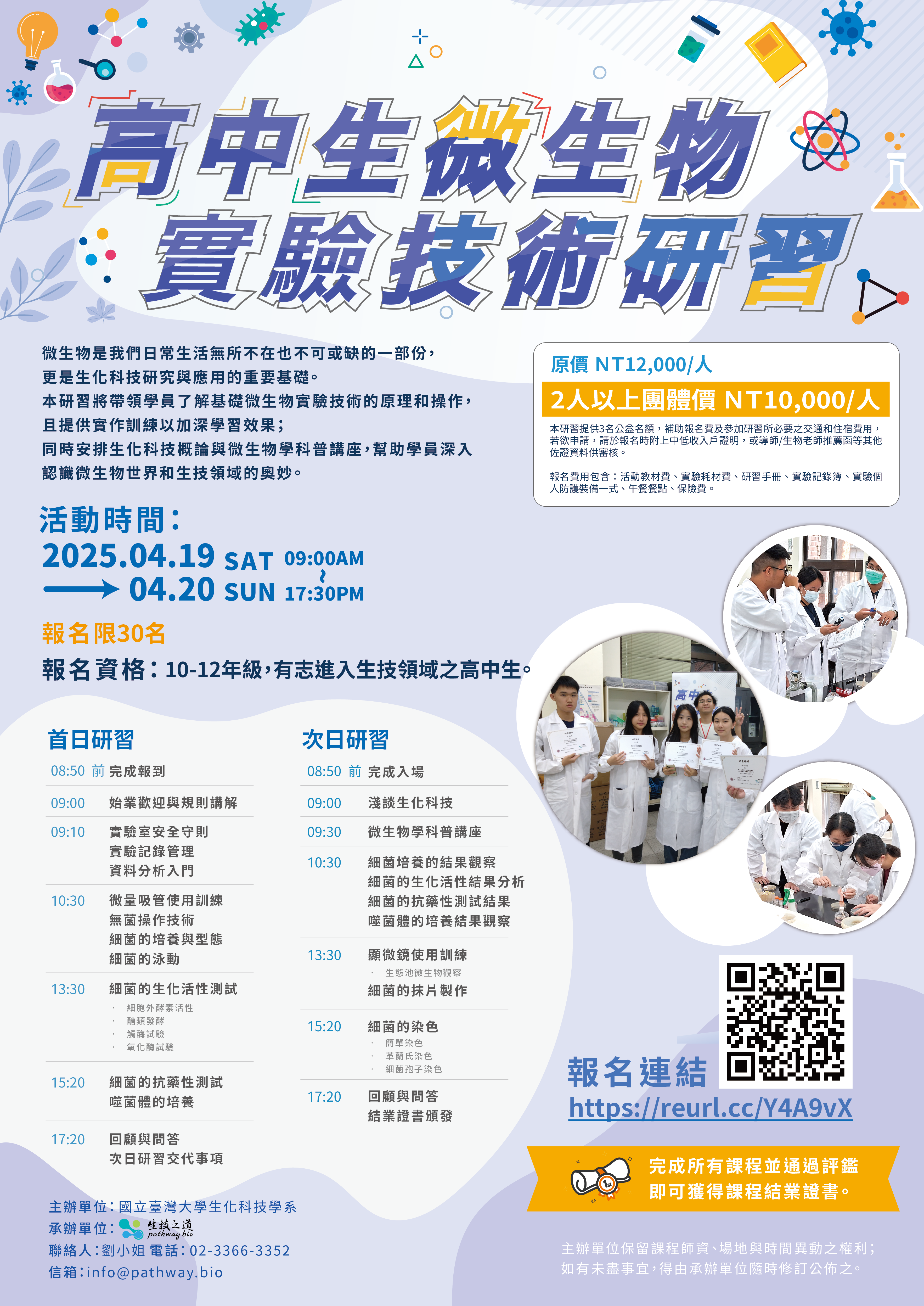 三、詳細時間、報名費用與內容說明,如附件海報及網頁;早鳥優惠至3月29日,名額限30名,敬請把握時間報名。