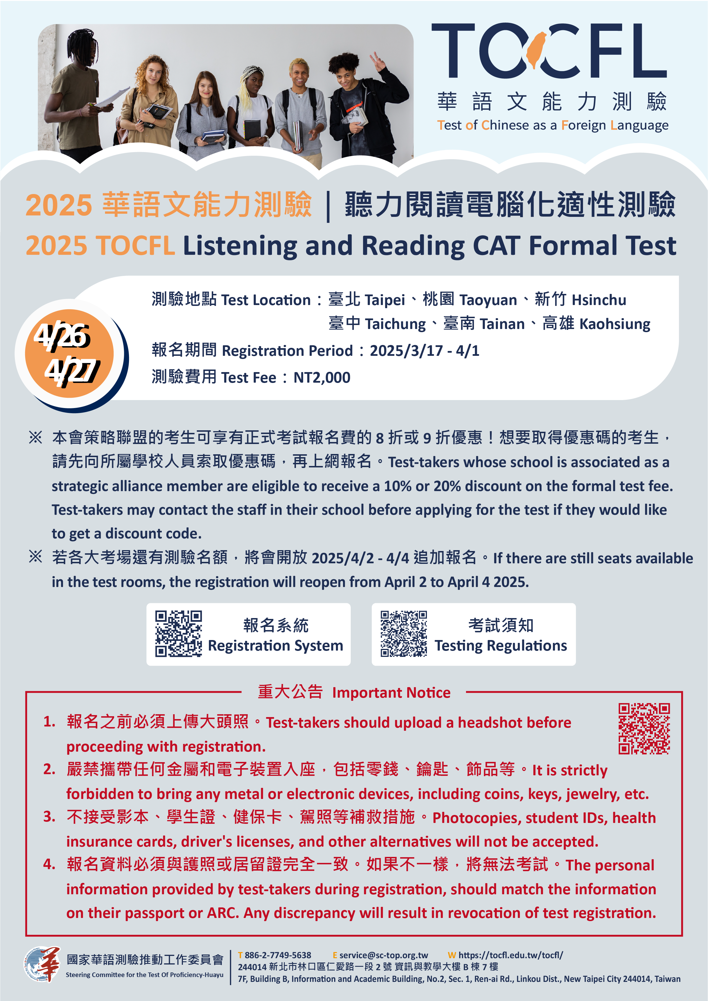 轉知國家華語測驗推動工作委員會「華語文能力測驗」114年4月正式考試事宜: