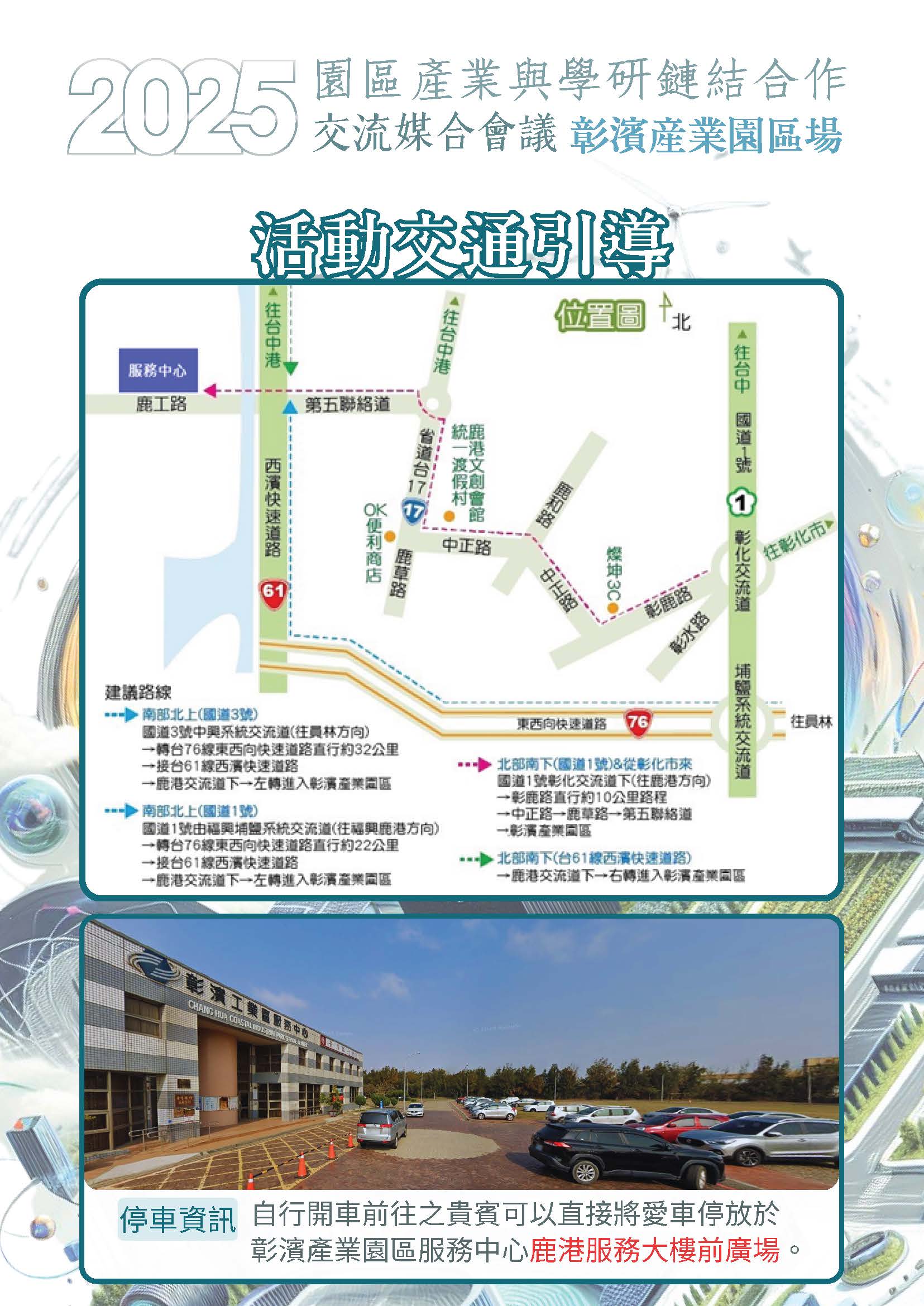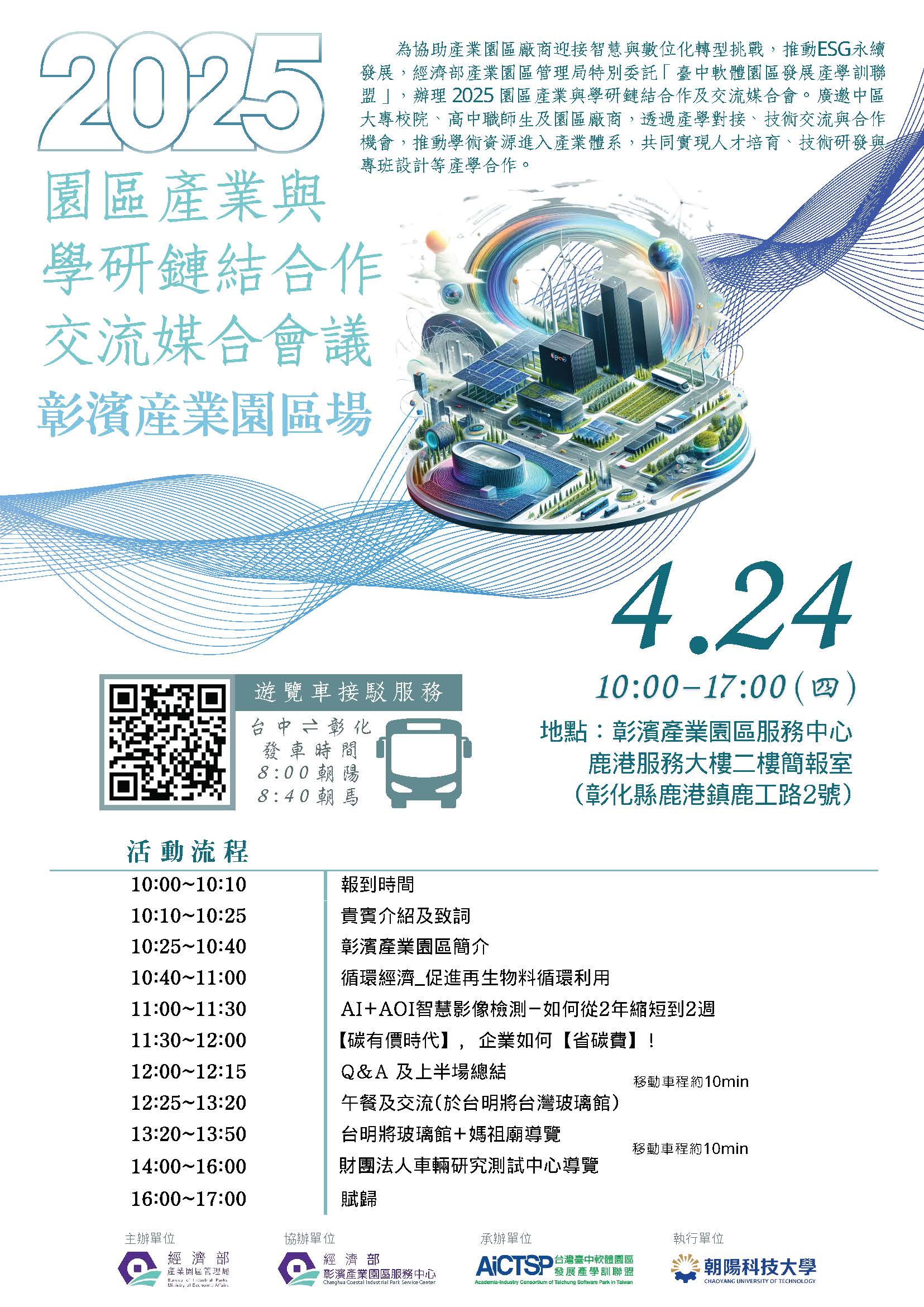 一、本校承接臺中軟體園區發展產學訓聯盟分包之經濟部產業園區管理局「園區數位轉型躍升計畫」辦理旨揭活動,特邀請高中職、大專校院、廠商及廠商協進會代表,共同進行產學交流與媒合。二、活動時間:當日上午10時至下午5時。三、活動地點:彰濱產業園區服務中心鹿港服務大樓2樓簡報室(彰化縣鹿港鎮鹿工路2號)。四、有意參加者請於114年4月18日前至活動網頁報名(網址:請點我)。本活動提供遊覽車共乘接駁服務,歡迎多加利用,詳情請見報名表。五、活動聯絡人:本校湯凱莉專員,電話:04-23323000分機3236;E-mail: 請點我。