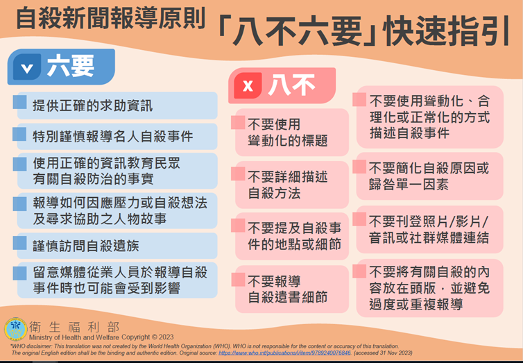 應,以協助傳播媒體及網際網路平臺業者遵循自殺防治法第16條規定,並依世界衛生組織自殺新聞報導原則「八不