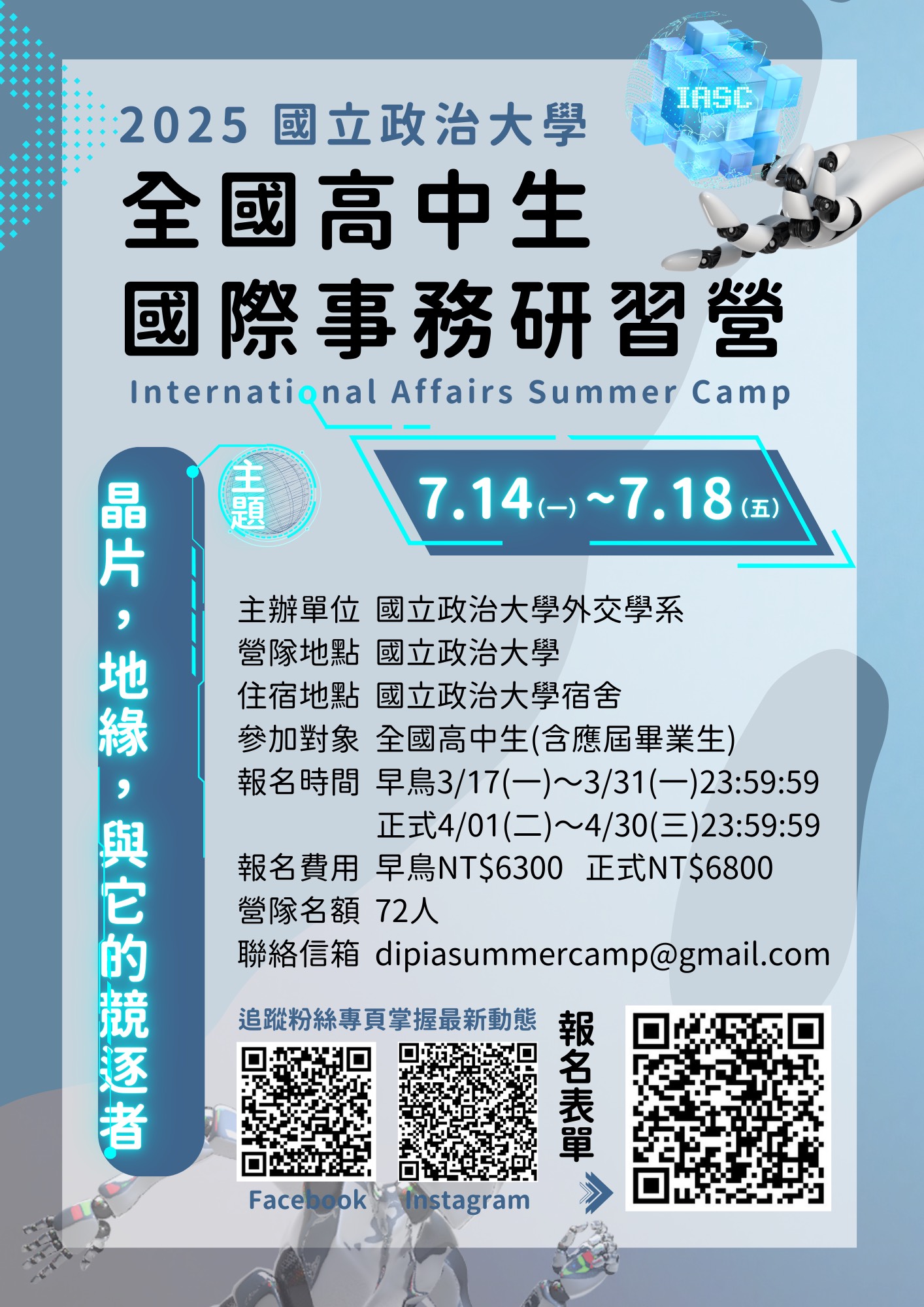 三、檢送活動海報電子檔,可自行影印使用,敬請惠予協助宣 傳並鼓勵學生踴躍參加。相關活動資訊請上活動官方臉書 粉絲專頁或Instagram頁面查詢:請點此 ,或FB搜尋「2025全國高中生國際事 務研習營」;請點此 ,或IG搜尋「2025政大外交國際事務研習 營」。