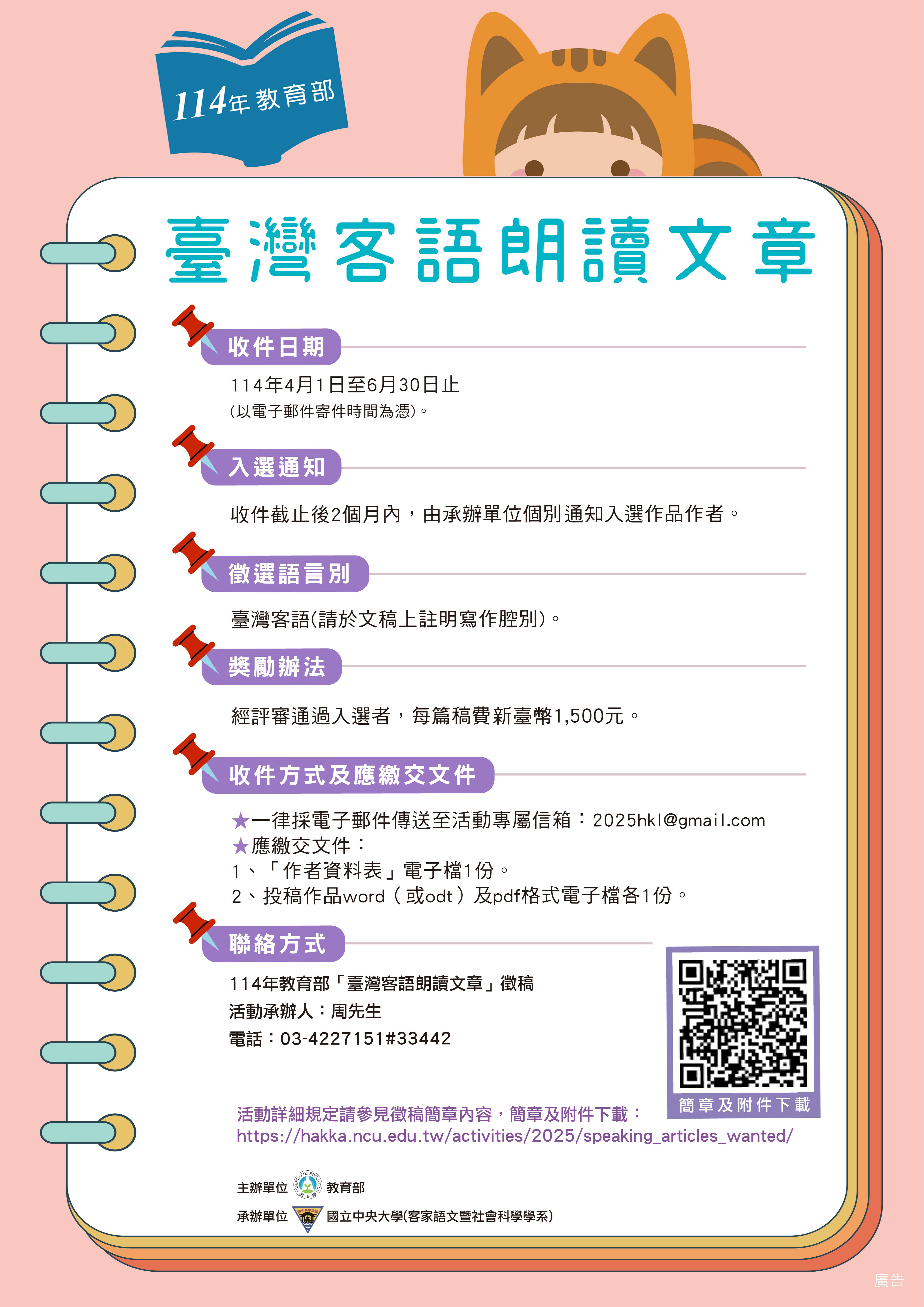 國立中央大學承辦教育部「114年臺灣客語朗讀文章徵稿活動」,相關資訊如下: