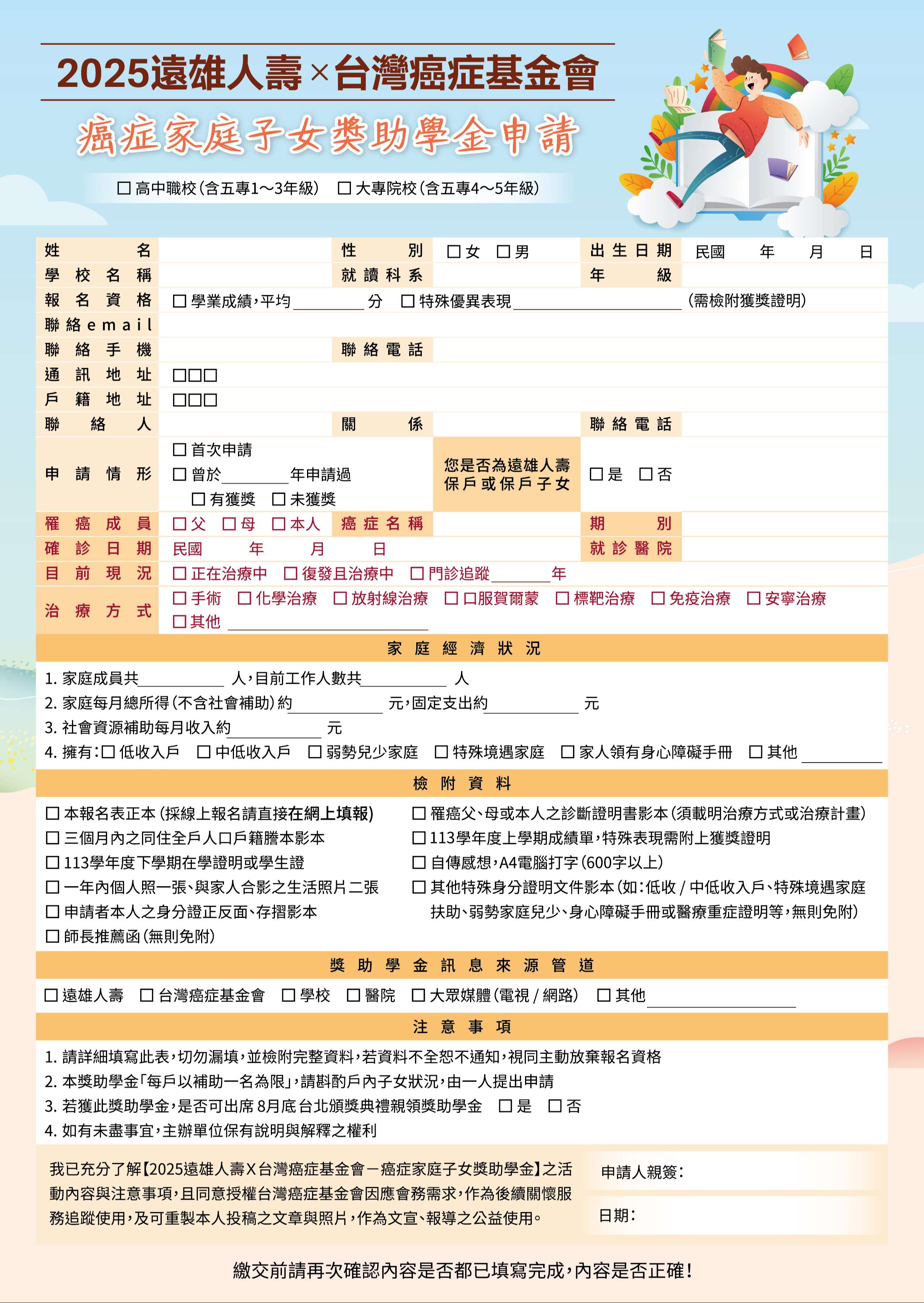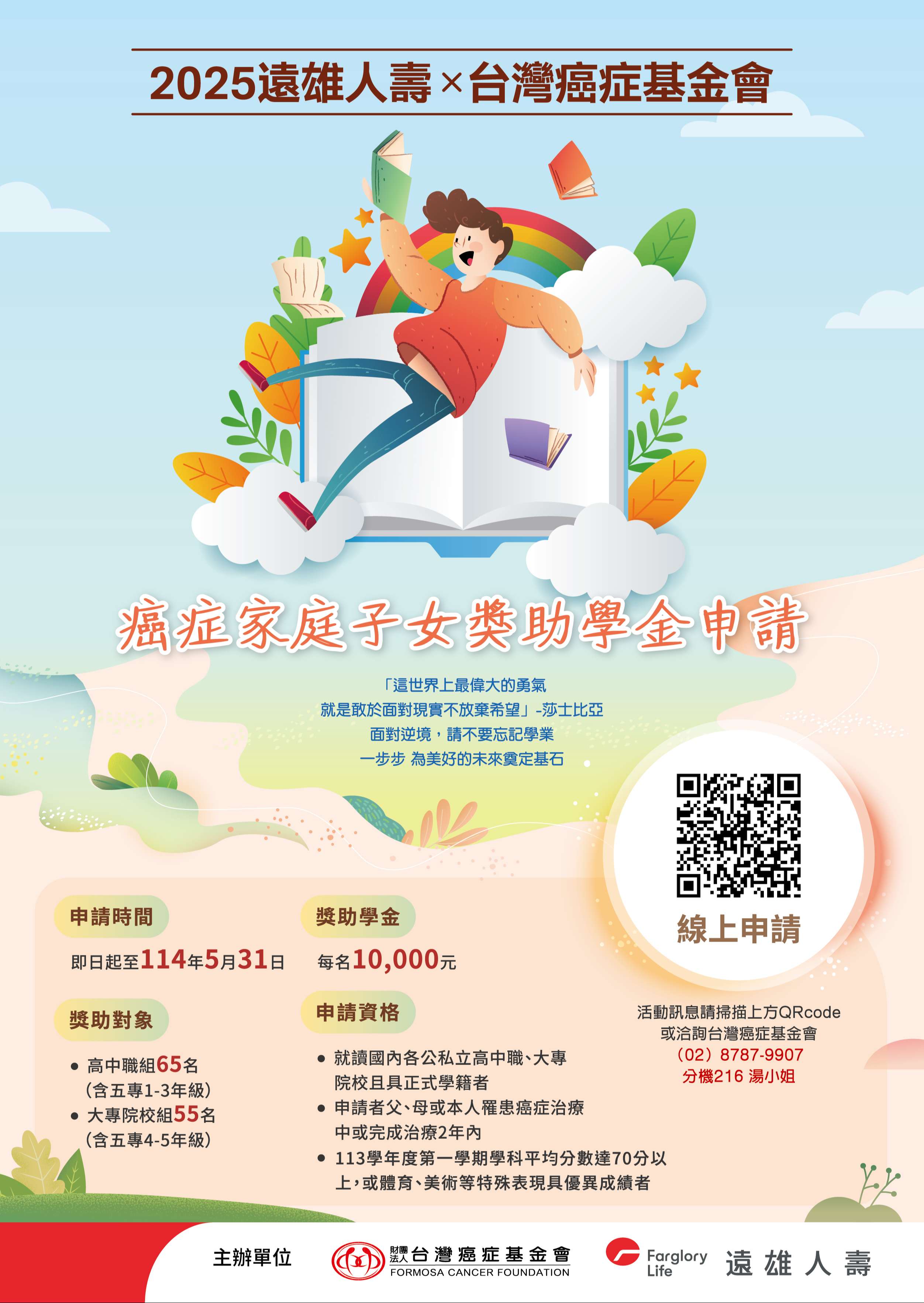 二、本會特規劃「2025台灣癌症基金會x遠雄人壽-癌症家庭子女獎助學金」活動,針對高中職與大專院校之在學學生,提供獎助學金,期藉此減輕癌症家庭之經濟壓力,亦讓其子女們在獎助學金的鼓勵下,感受社會對癌症家庭的支持,更激發其積極向學之心。