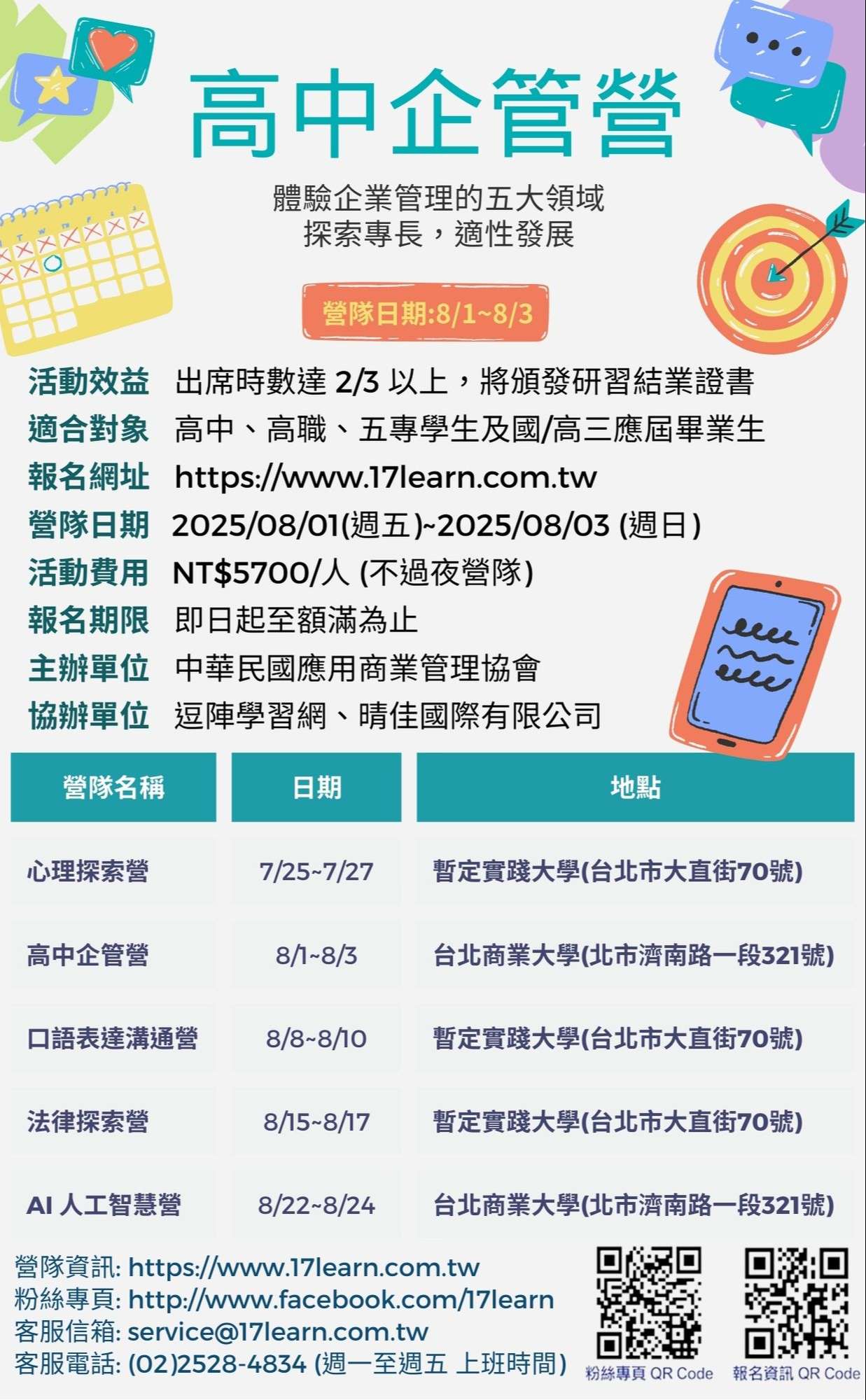 十、另有【心理探索營】、【AI人工智慧營】、【口語表達溝 通營】、【法律探索營】等營隊,歡迎報名參加。