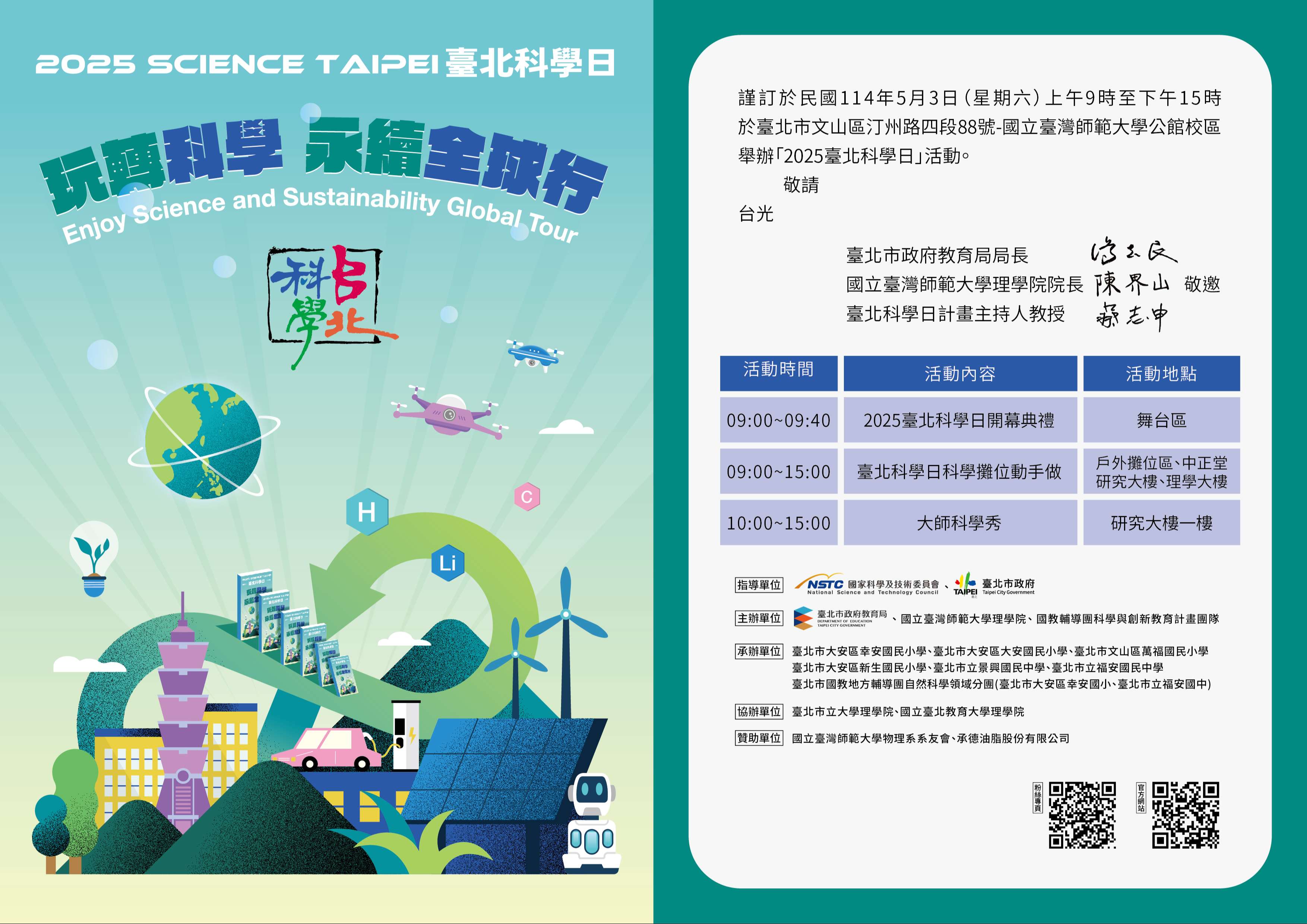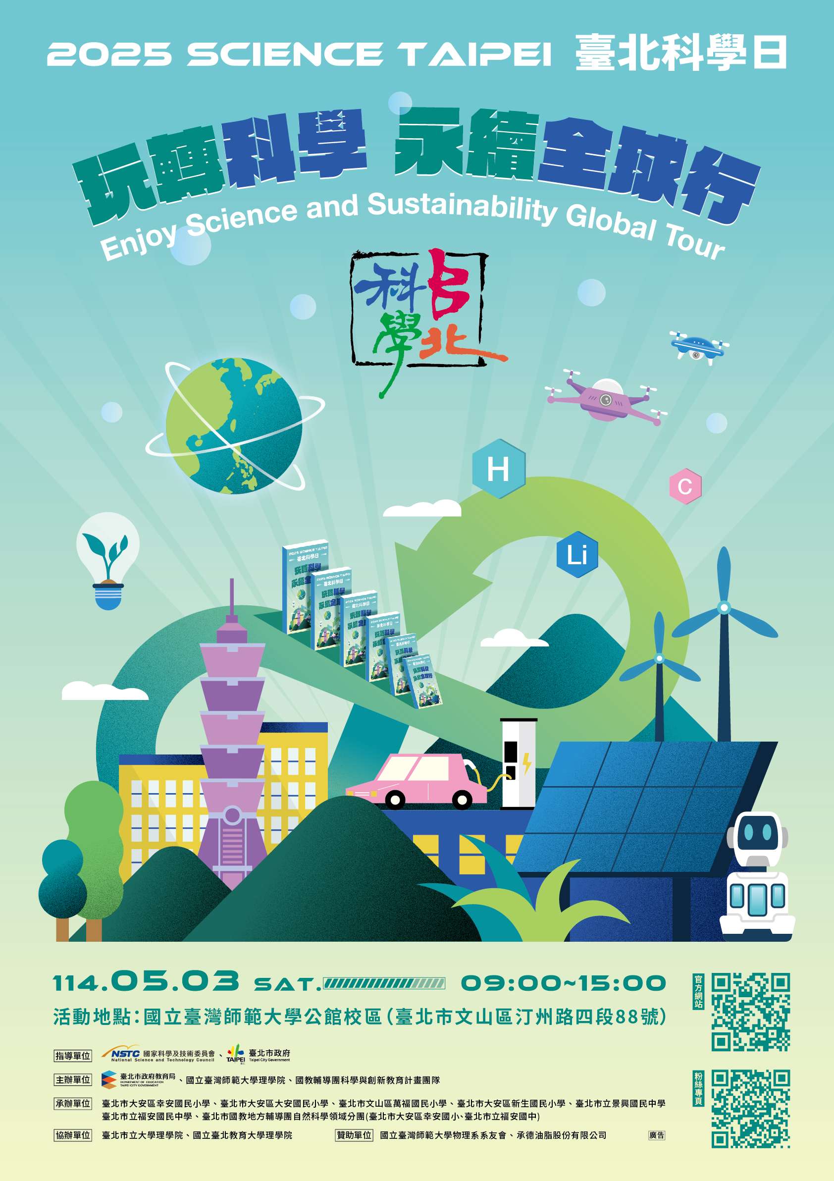 一、本局與國立臺灣師範大學理學院物理學系合作舉辦,本年度將於114年5月3日(星期六)假師大公館校區辦理科學體驗實作活動,並響應聯合國教育科學及文化組織「永續發展國際十年(IDSSD)」理念,藉本活動「玩轉科學-永續全球行」之主題,彰顯本市對於推動科學教育的重視。