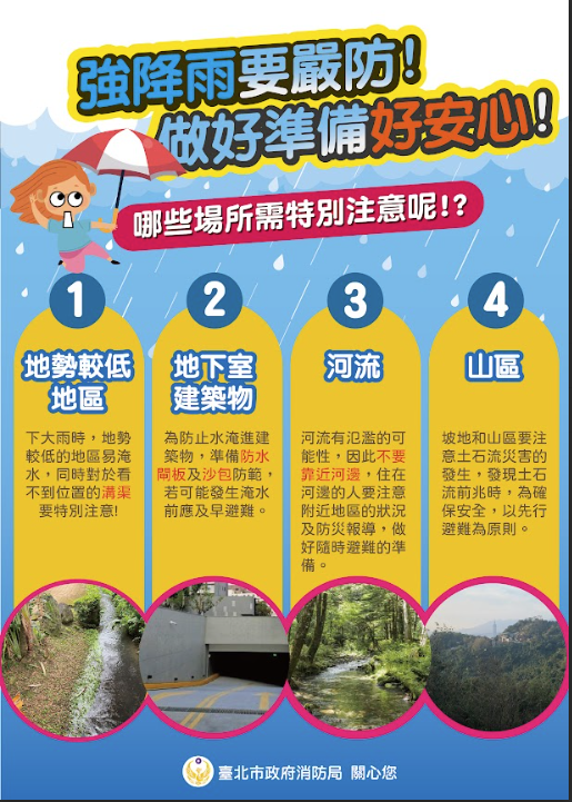 汛期即將來臨,請民眾提前做好清淤排水,注意氣象與災害資訊,提高警覺。若前往山區或河邊等地區,應隨時注意環境變化,如發現任何異 常,應馬上撤離,以維生命安全。