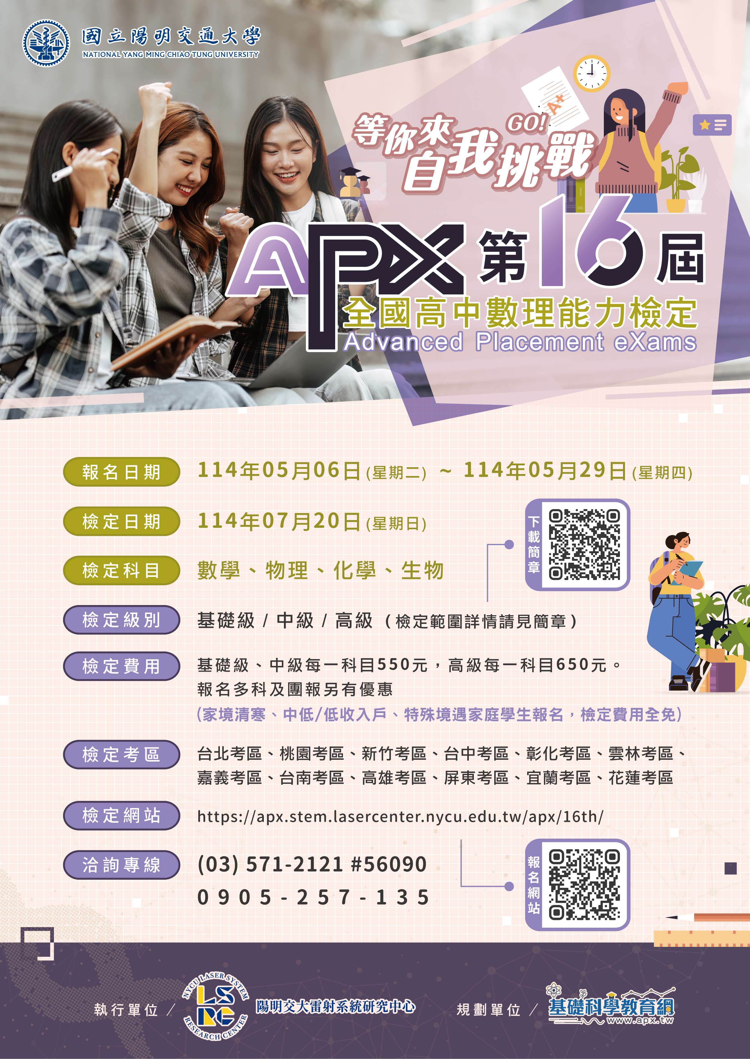 一、檢附APX全國高中數理能力檢定第十六屆報名簡章及海報。本屆劃12個縣市考區,服務各地考生。