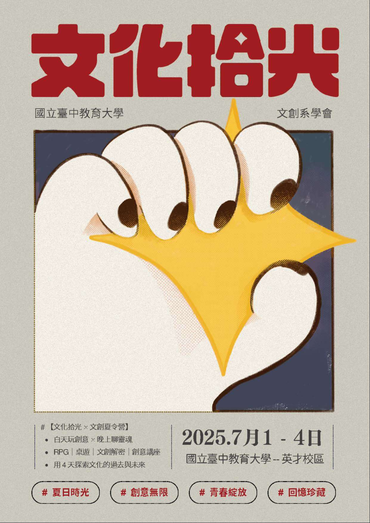 二、本校文創學系辦理2025年《文化拾光》夏令營活動,透過 營隊主題,我們將一點一滴拾起過去的珍貴文化,並賦予 它全新的生命。在這裡,我們不僅是回顧與傳承,更是用 創意和勇氣,重新定義文化的價值,讓它在當下與未來之 間架起一道光的橋樑,並使我們在這場文化盛宴中,一同 拾取散落在角落的光芒,將它們編織成屬於我們的藝術未 來,啟動無限可能,創造屬於這一代的文化新篇章。