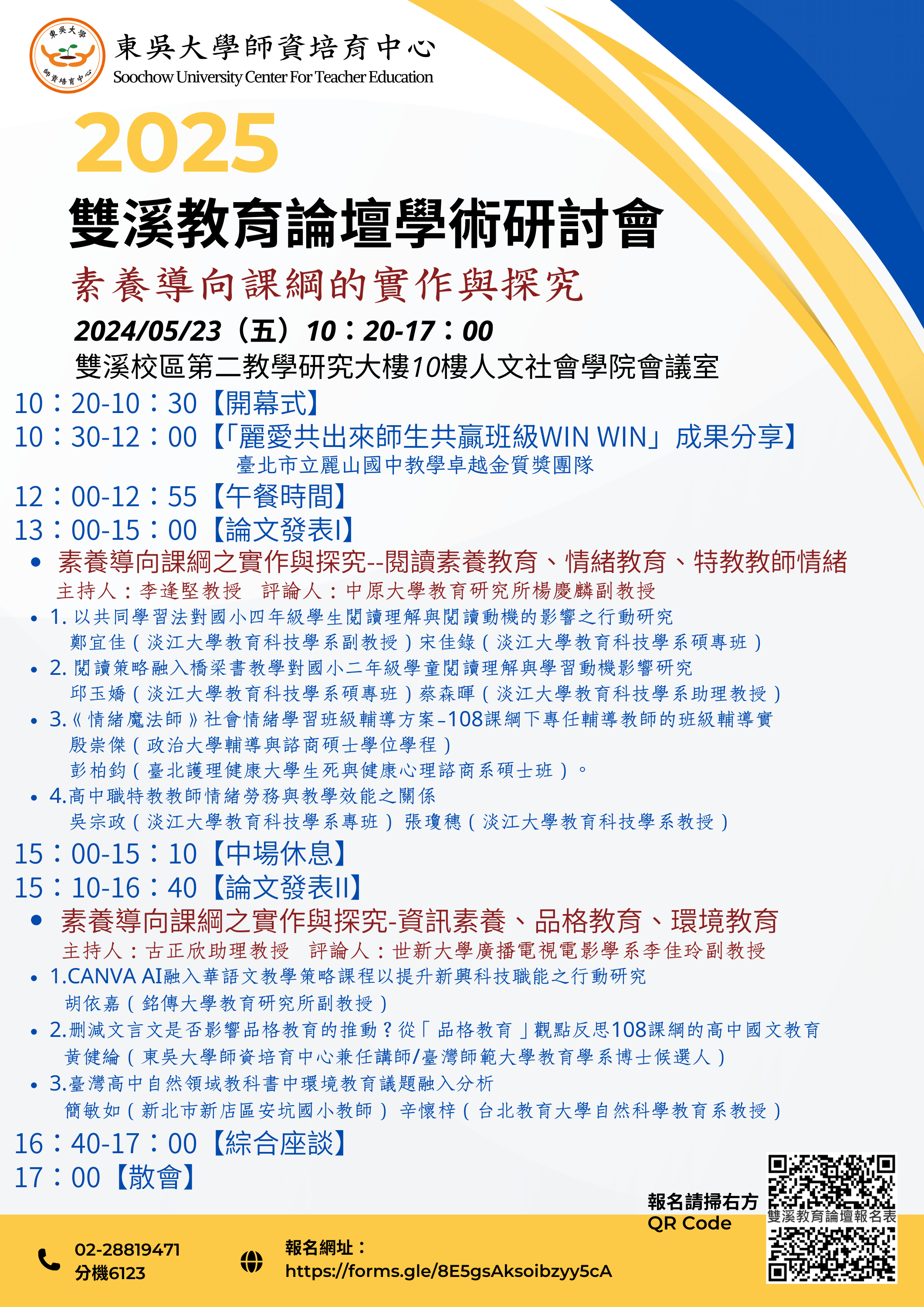 二、下午1時至5時安排兩場次論文發表會,研討主軸聚焦於素 養導向課綱之實作與探究,涵蓋環境教育、品格教育、資 訊素養、閱讀素養教育、情緒教育及特殊教育教師情緒等 多元面向。活動時程與內容詳如附件海報,敬請參閱。