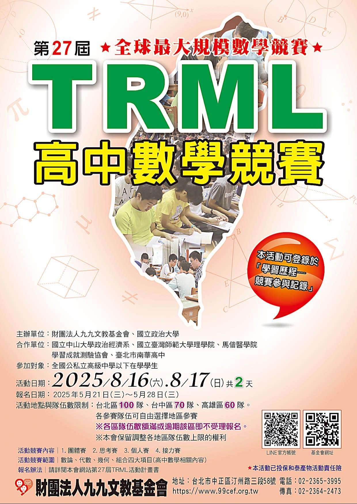 三、報名時間:民國114年5月21日(星期三)上午10:00起至5月28日(星期三),各地區參賽伍數額滿或逾期即不再受理報名。
