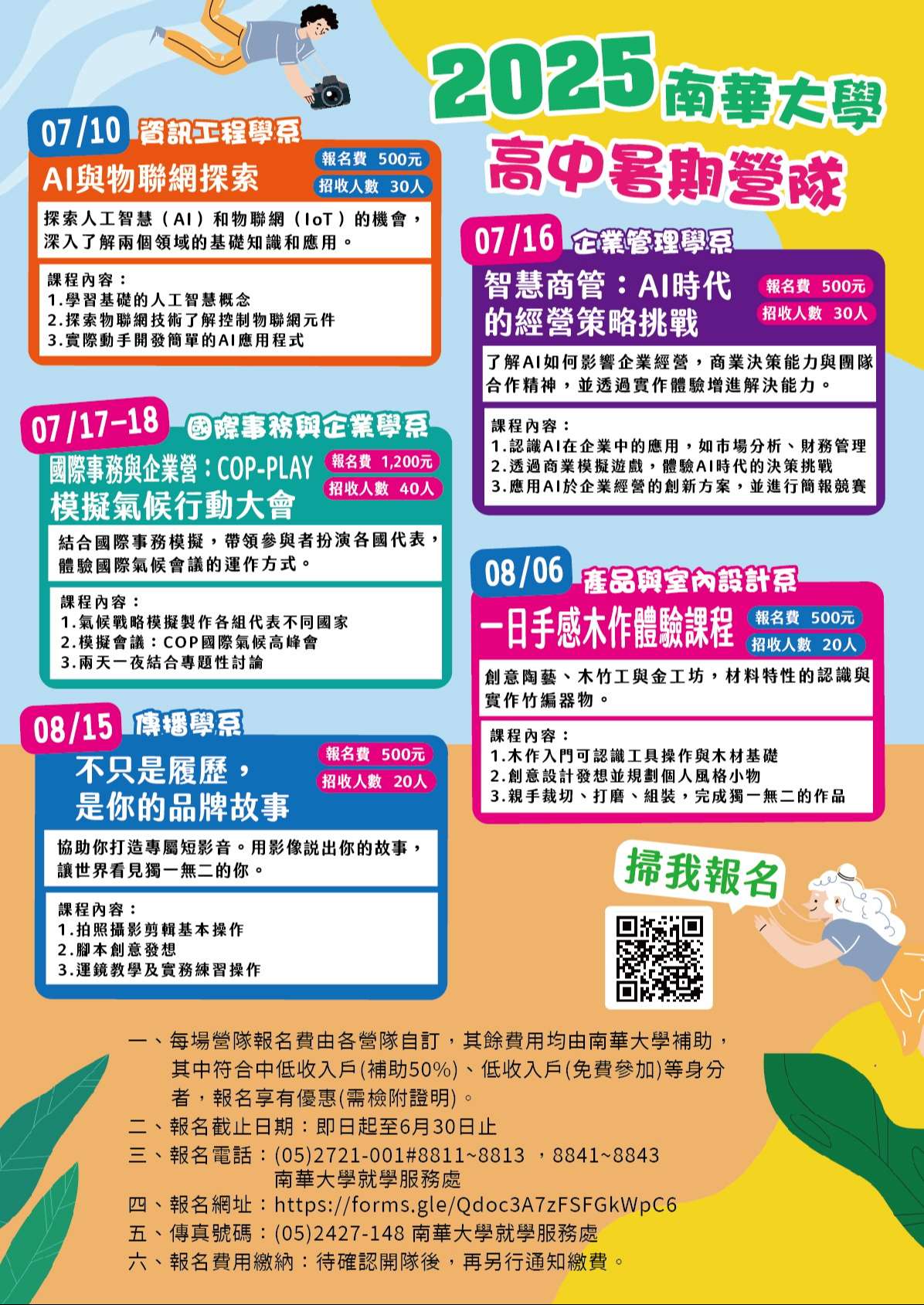 一、為增進高中學生認識大學校系特色及未來升學進路,協助 學生自我探索,激發學習興趣,本校於暑假期間開辦各類 高中生營隊,內容涵括社會、資訊、管理、藝術等領域, 活動多元、內容精彩豐富。敬請轉知貴校同學並鼓勵踴躍 報名參加各營隊活動。